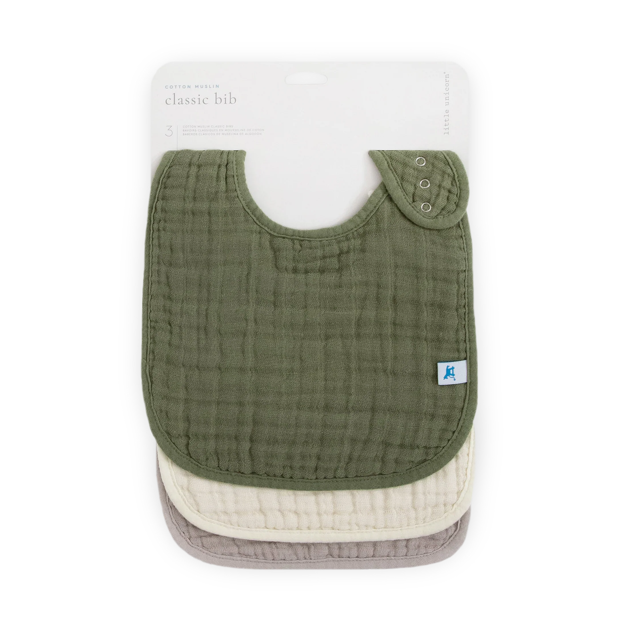 Soft and absorbent, our multi-layer bibs are built to handle all of baby's spills and messes. Featuring three unique, hand-painted prints and a snap-on function to ensure a snug fit that grows with your baby.