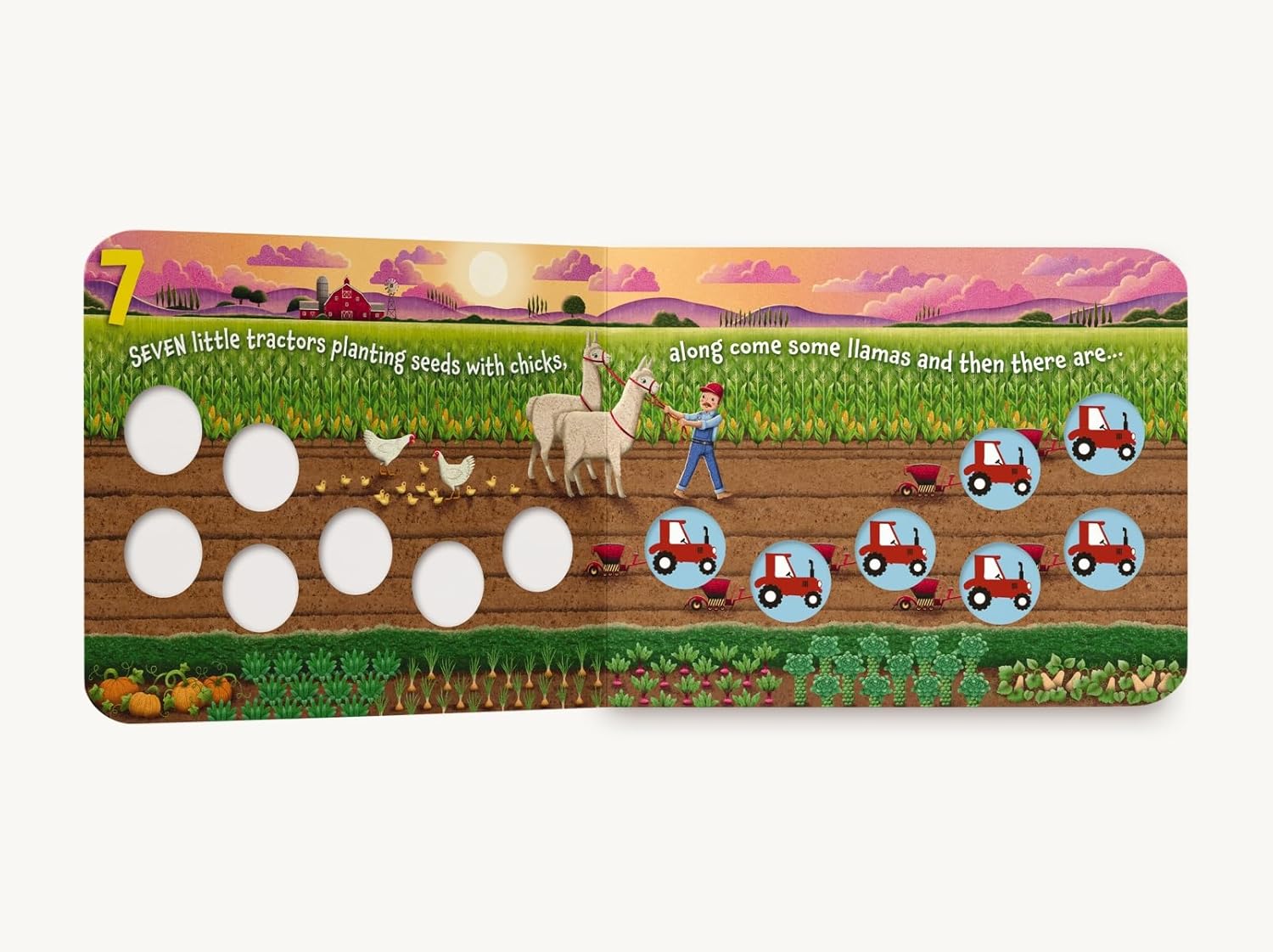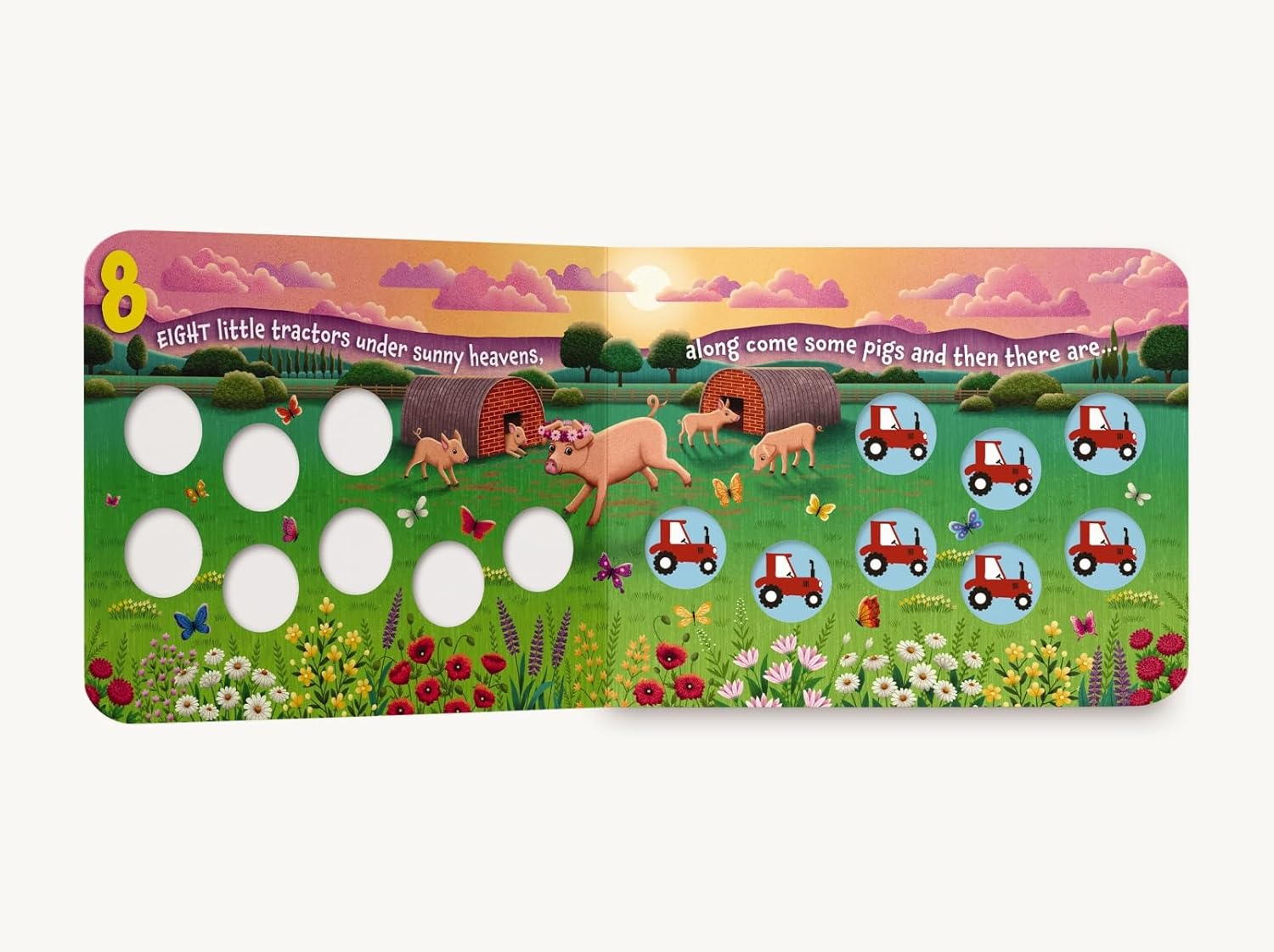 Ten little tractors in the bright sunshine, along comes a cow and then there are…nine! Learning to count has never been more fun. This unique board book counts from ten little tractors all the way down to one with adorable illustrations. With each page, one more tractor disappears. To demonstrate this concept, this book uses tactile tractor buttons to help children count how many little tractors are left as the story progresses. Follow along with the easy rhythm and rhymes of this story and let your child touch the colorful, built-in toys for a creative, hands-on approach to counting. Start young ones on a lifetime of loving reading and learning with Ten Little Tractors.