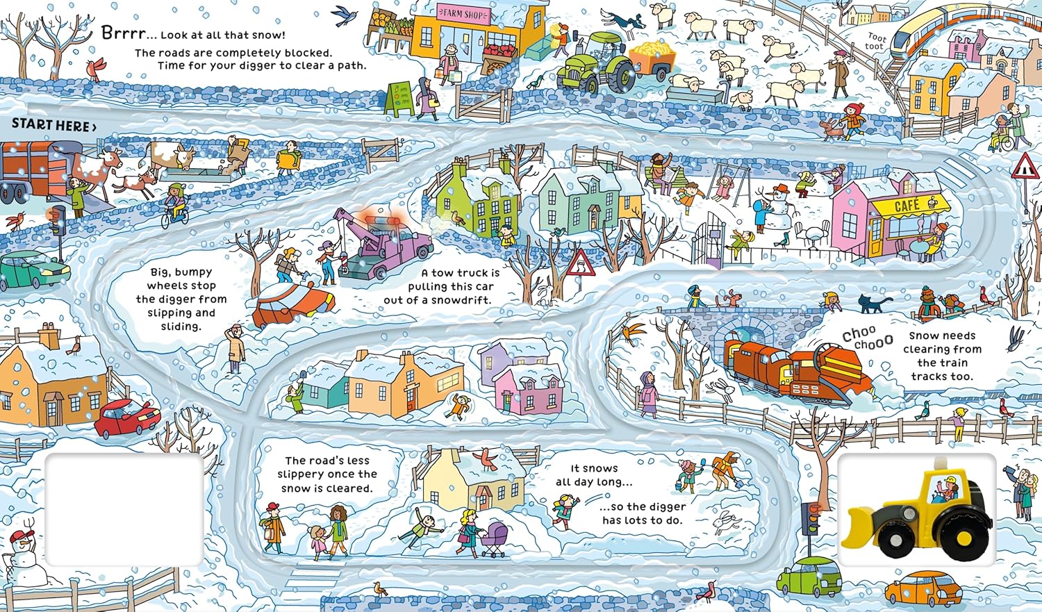- This large, chunky board book comes with a wind-up yellow digger and four embedded tracks.