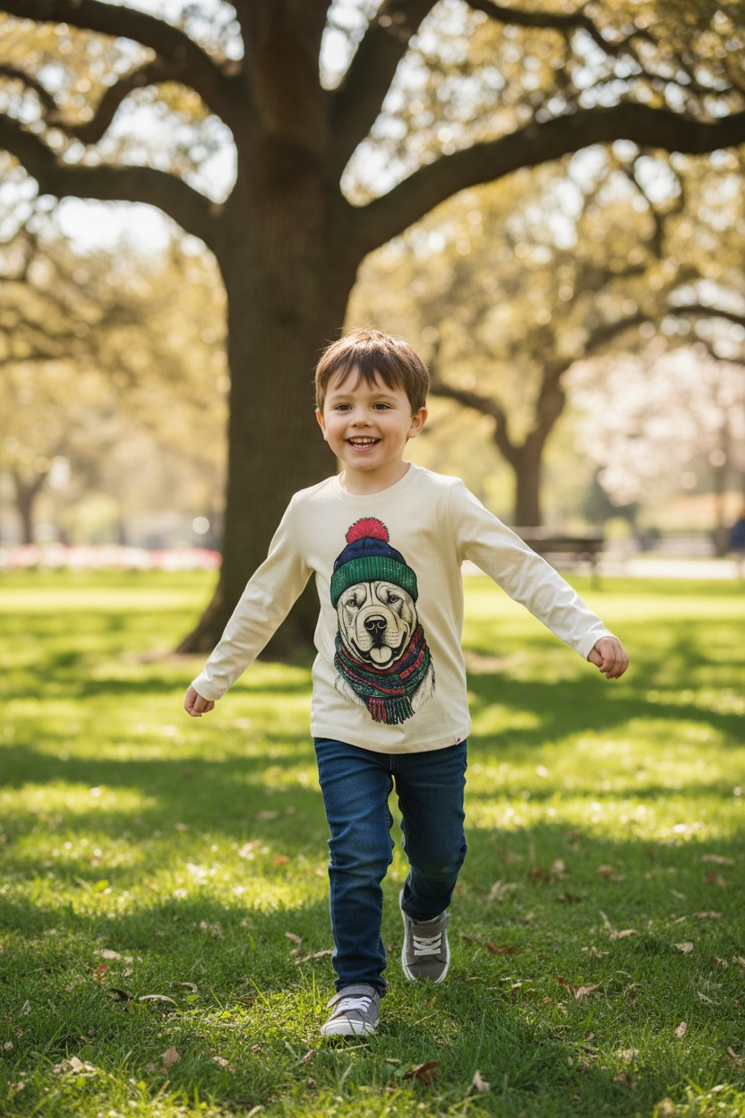 The Graphic Long Sleeve Tee in Ivory is a fun and cozy addition to your child's wardrobe! Made from 100% soft cotton, this tee feels as great as it looks. Featuring a playful design of a dog rocking a blue, green, and red winter hat and scarf, it?s the perfect mix of cute and cool. Whether layered under a jacket or worn solo, this versatile piece brings a smile and a touch of warmth to any outfit. Parents will love the quality, while kids will adore the fun design?ready for school, play, or cozy days at home!