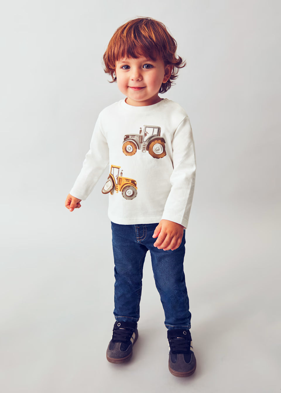 Long sleeved T-shirt for baby. Round neckline. Snap button fastening on the shoulder to allow the garment to be put on easily. 100% cotton. Decorative elements: decorative applique. Garment with removable element belonging to our interactive collection PLAY WITH. Pattern with motor motifs.