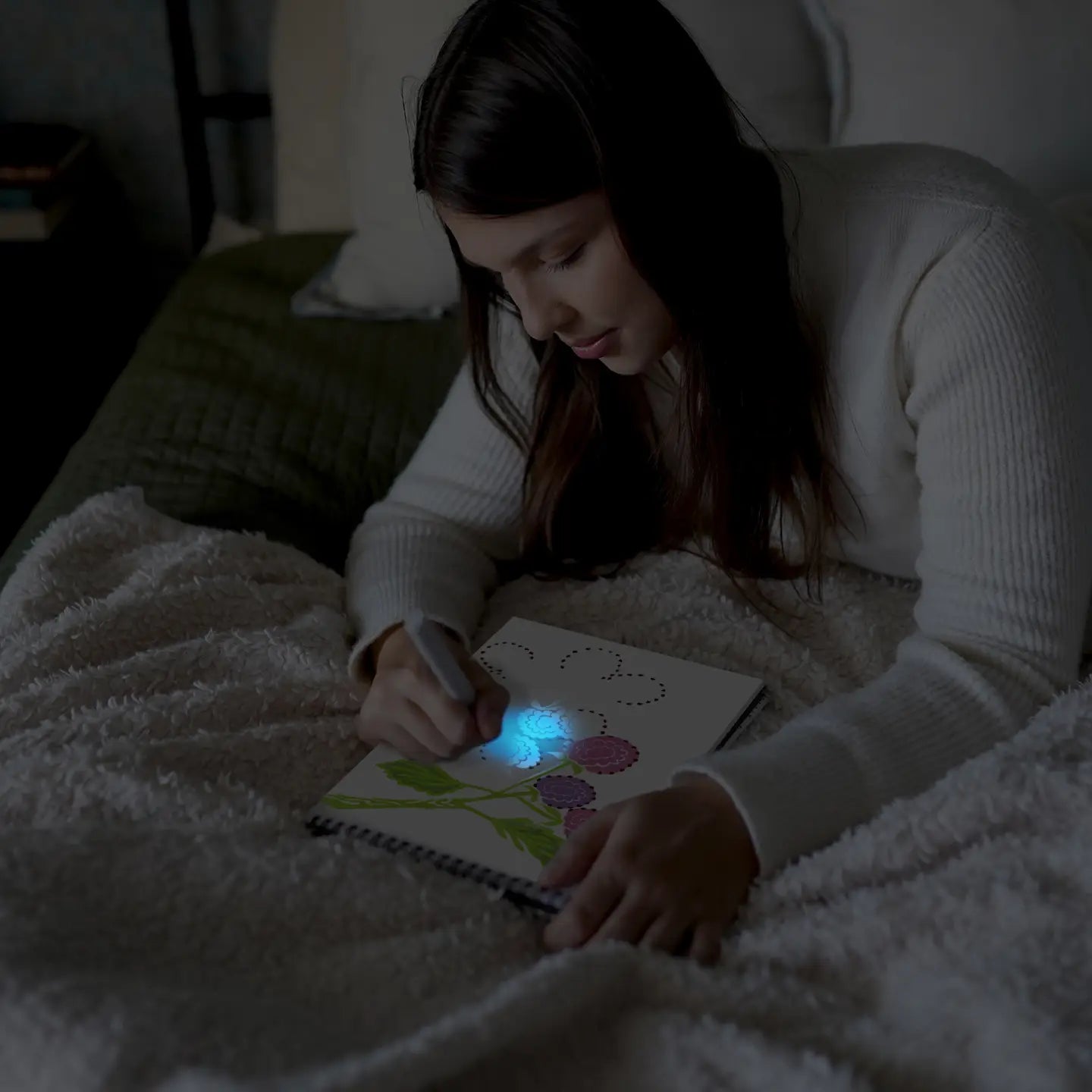 Lifelines FlowArt Pads are guided art meditations designed to help you achieve a calming flow state. Each scene is thoughtfully crafted to encourage repetitive, relaxing movements, promoting mindfulness and reducing stress. UV Art includes 20 meditative scenes and an innovative illuminating marker with 5 interchangeable colors, all in a detachable storage tray. Hover the marker's UV light over the page to reveal hidden, traceable scenes. Experience full immersion into this mesmerizing activity, as the illumination brings captivating detail to life, drops you into your flow, and results in a striking scene. Compact and portable, this pad is perfect for calming your mind on-the-go, unwinding before bed, or taking a work or study break to de-stress.