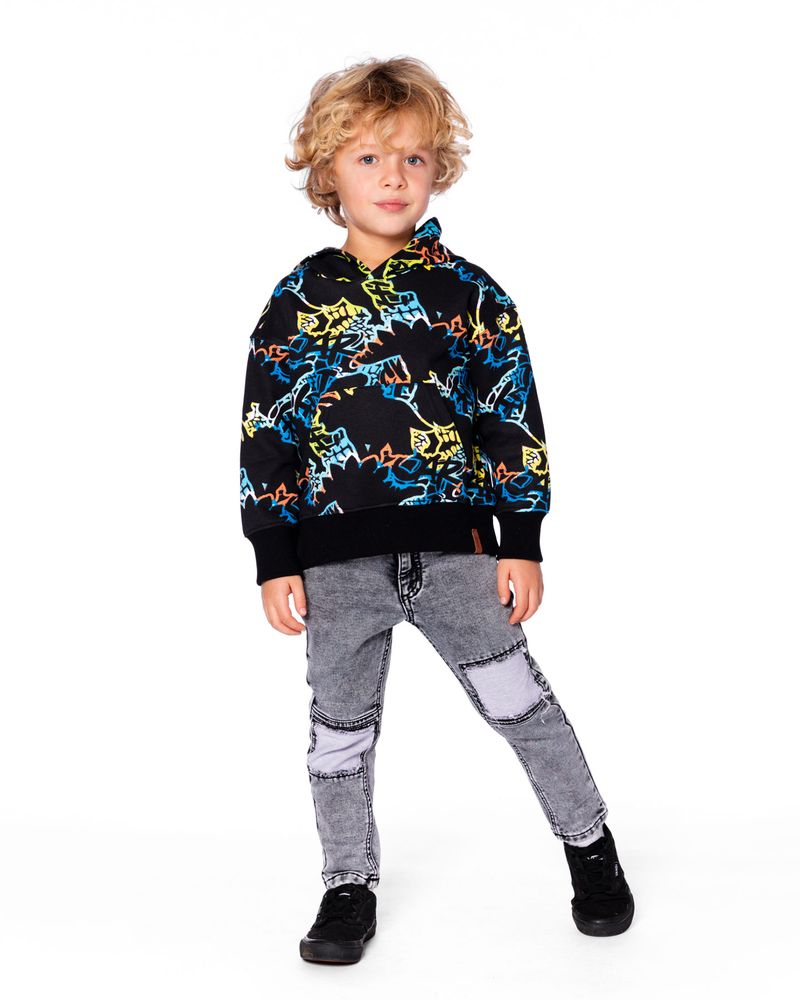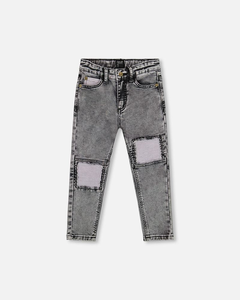 With patches on each leg, these French terry jeans mix and match effortlessly with every tee, sweatshirt, and sweater in his wardrobe. Ultra-soft and stretchy in cotton/poly French terry, these denim-inspired bottoms feature a five pocket silhouette with straight legs, logo buttons and rivets, and contrast patches at the thighs and knees.