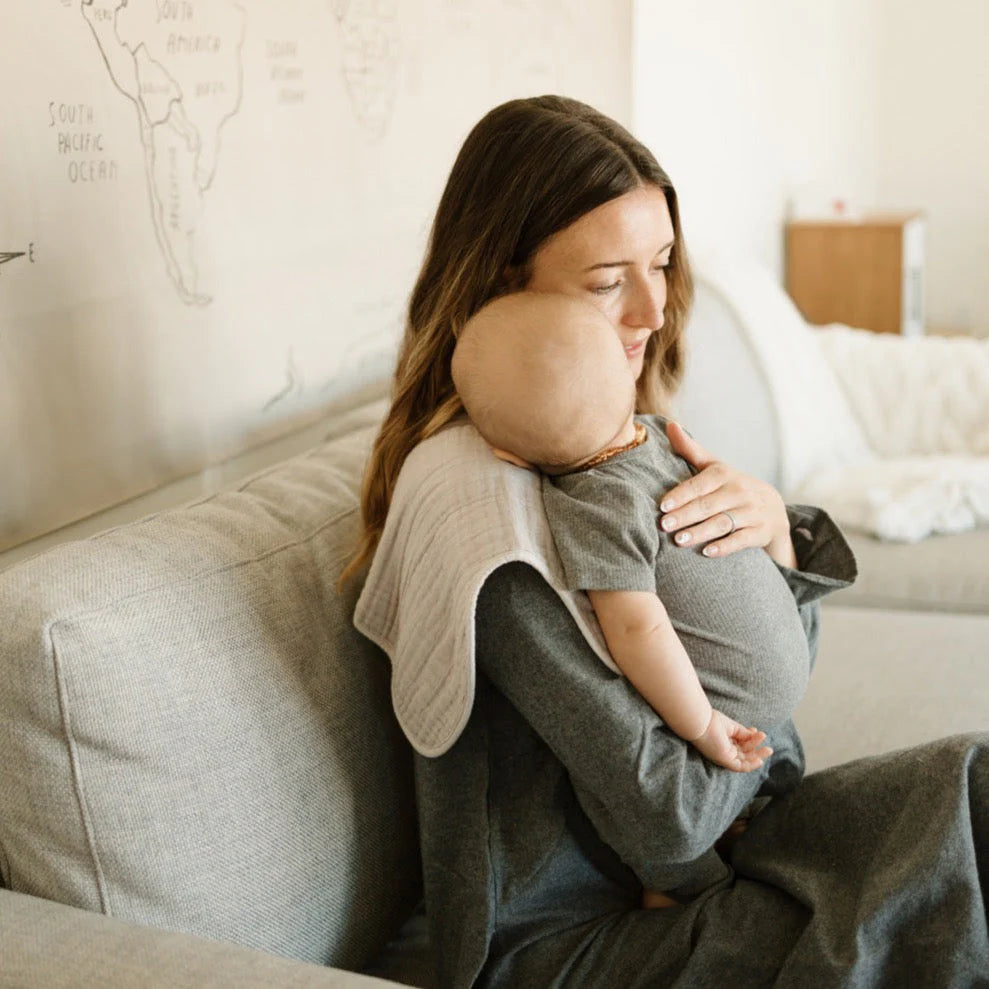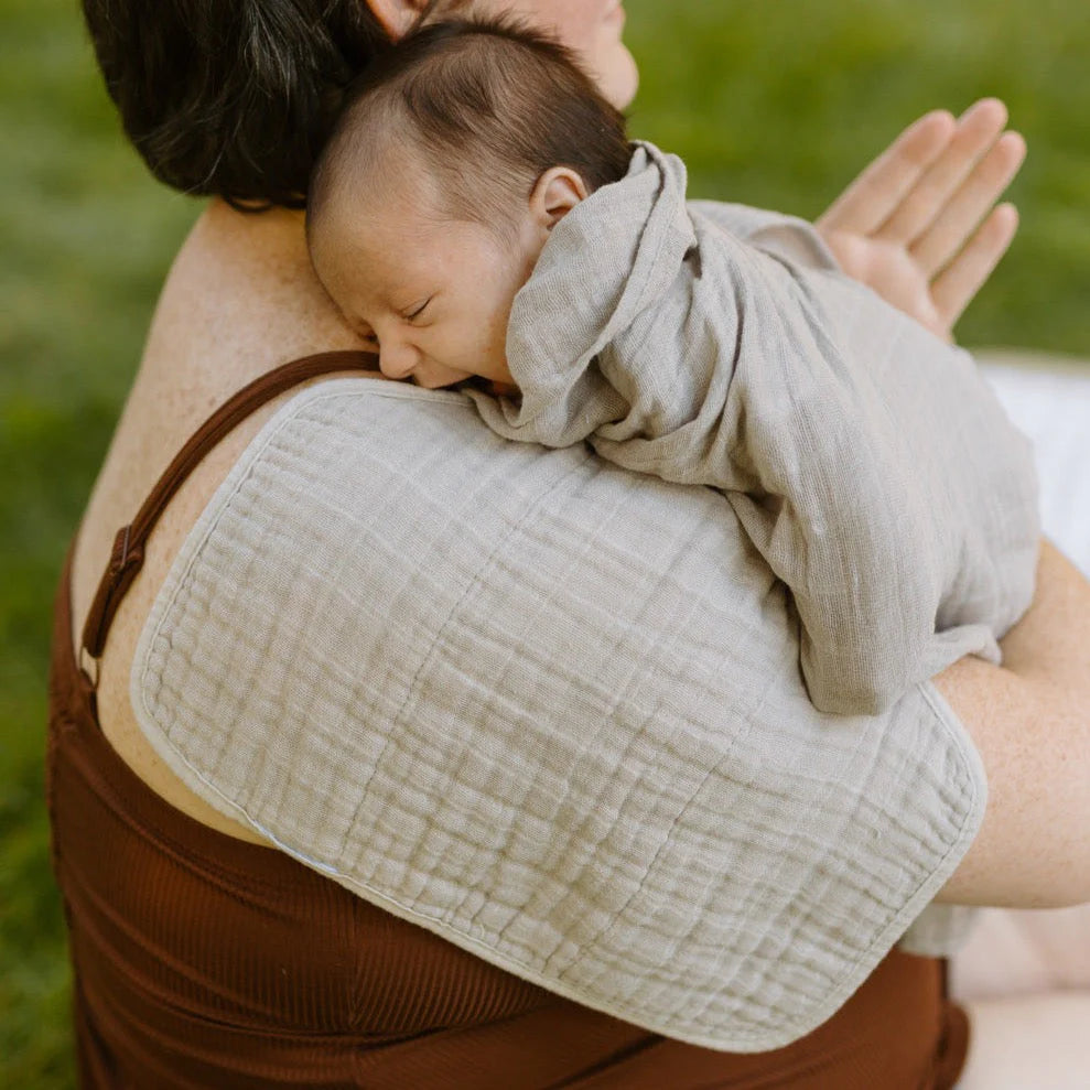 There's no use crying over spilled milk. With 4 absorbent layers of cotton muslin and an innovative shape, our burp cloth keeps you clean and dry while baby's snuggled tight.