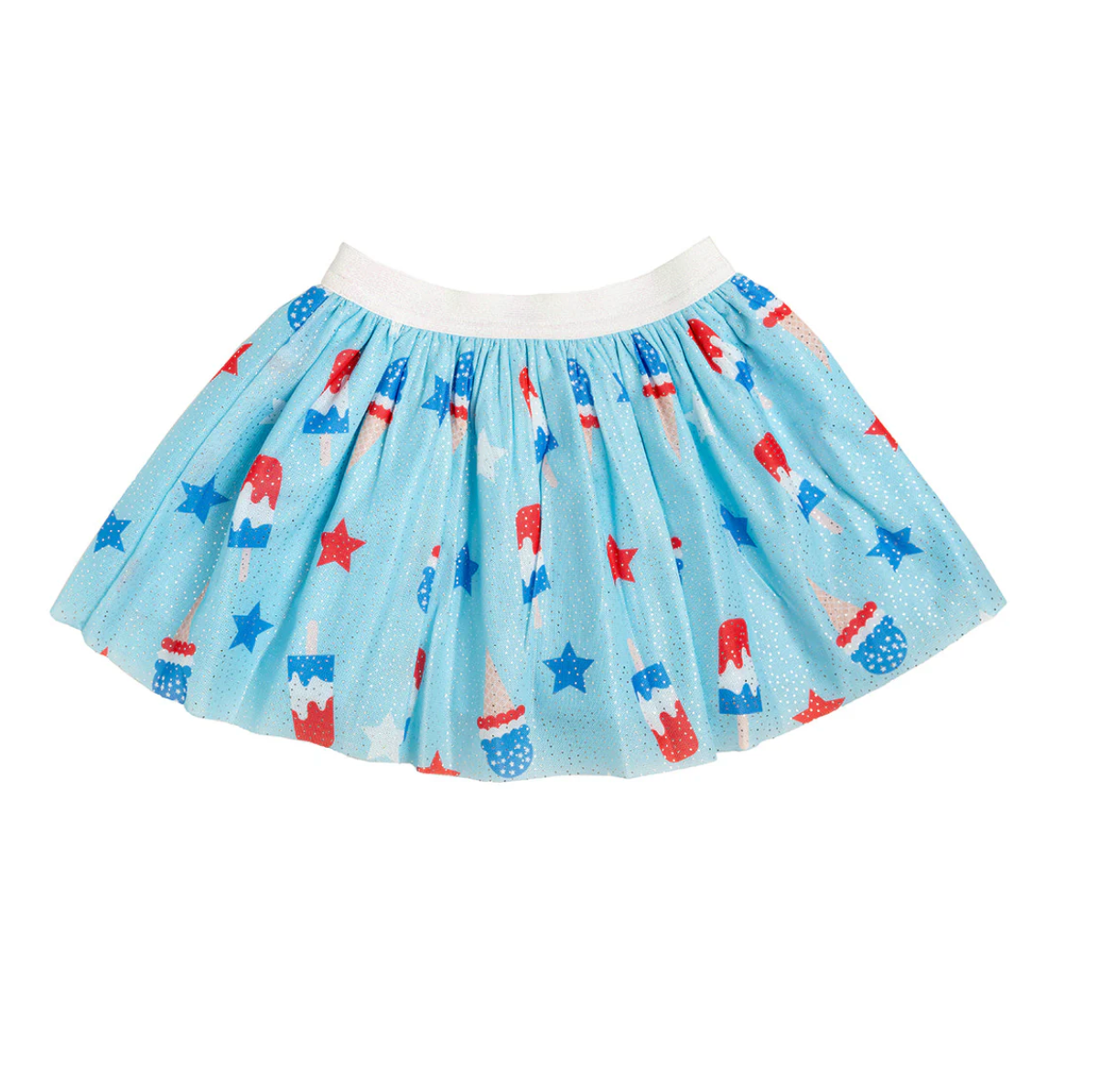 - Light blue tulle printed with a bomb pop pattern accented with silver glitter pin dots