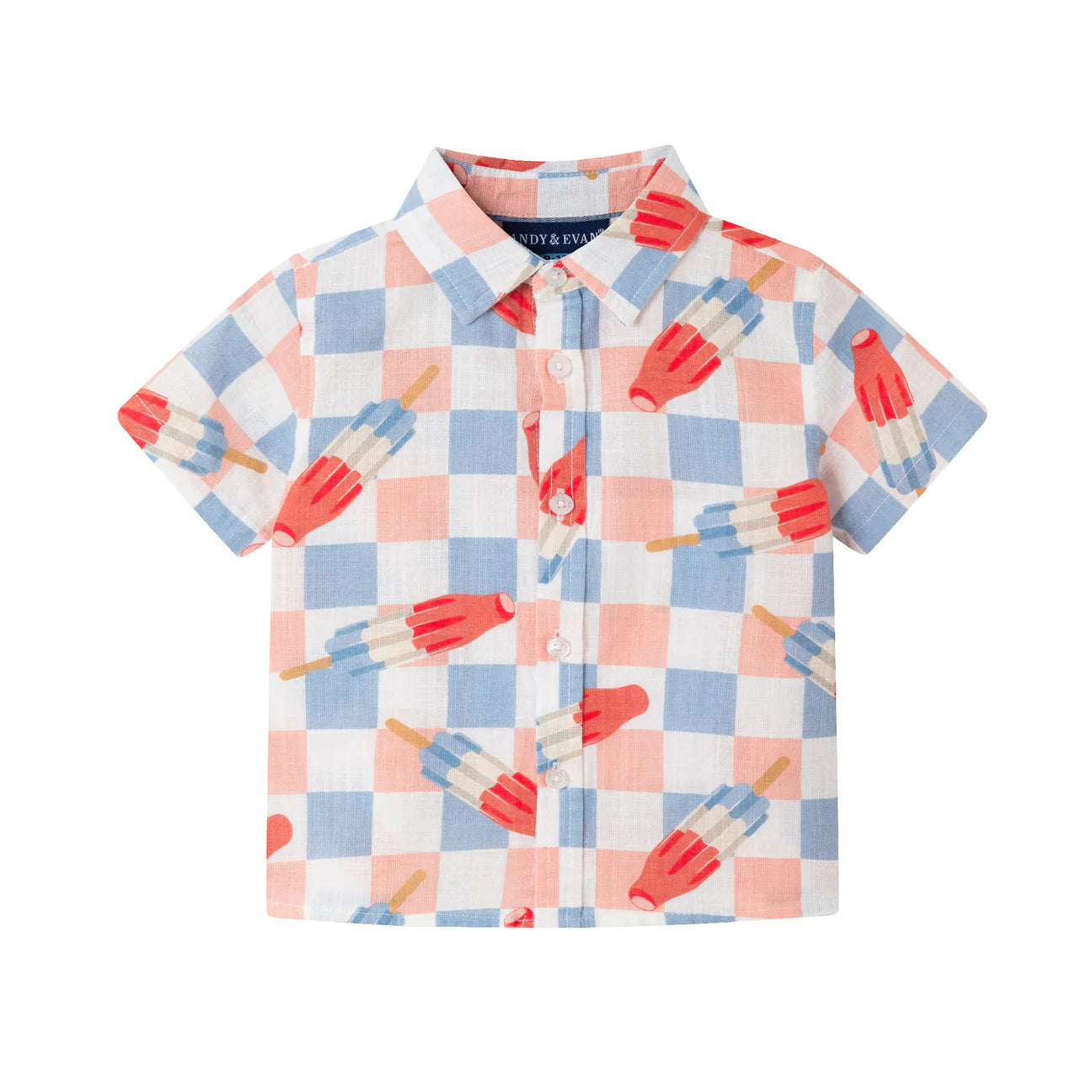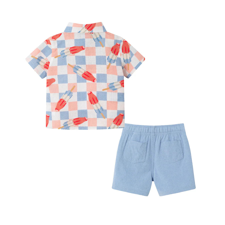 - Playful Design: Popsicle-themed print on a colorful checkered button-up shirt paired with light blue chambray drawstring shorts for a cheerful look.