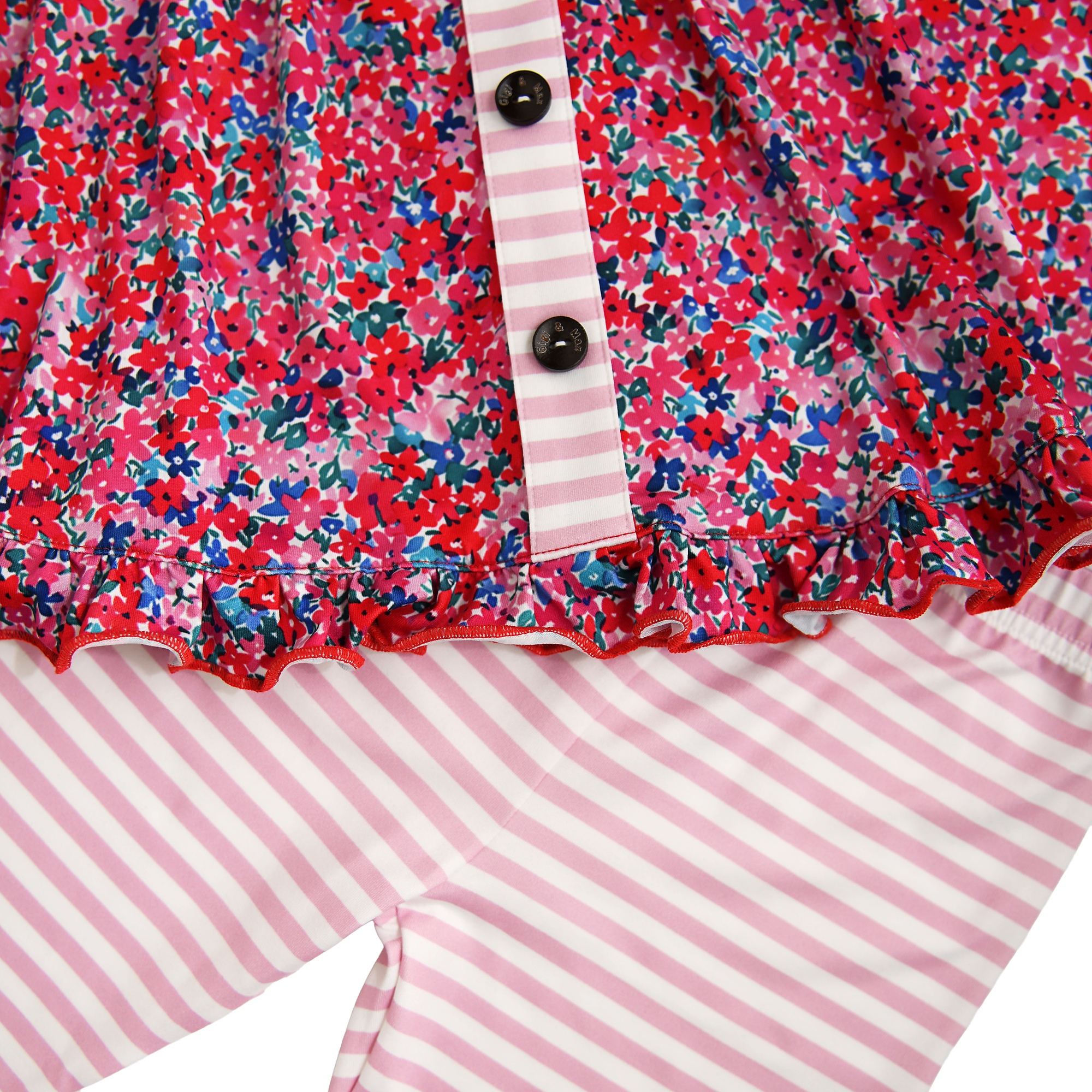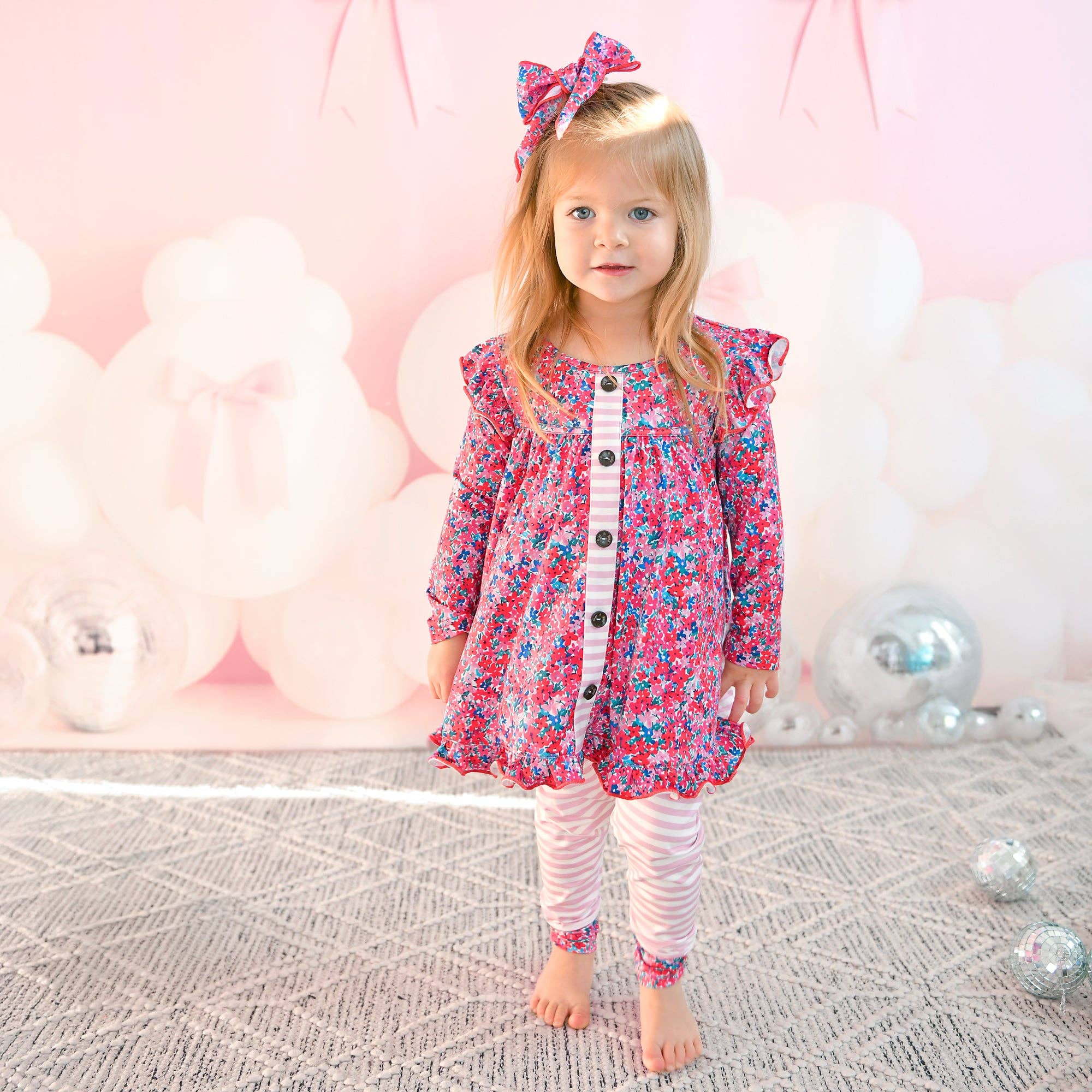 Due to manufacturing at different times, some Belle Bow Print items may have a slightly more pink-toned background than others. The difference is subtle but may be noticeable. This adorable outfit is a must have for your little cutie, it's super soft and so comfortable! The fabric we used is super stretchy and breathable, wait until you feel how soft it is! Made from a polyester/spandex blend, this fabric is a little thicker so the body of the peplum has some volume. It lays so nicely! This set is not made from bamboo These run about one size big, please size down if you want a true fit now. We do not recommend sizing up with this set. Sizes available : * 3-6m (runs big!) * 6-12m (runs big!) * 12-18m (runs big!) * 18-24m (runs big!) * 2t/3t (runs big!) * 4t/5t (runs big!) * 6/7 (runs big!) Wash instructions : wash on cold and lay flat or hang to dry. Wash instructions are screenprinted into the neck area of the outfit.