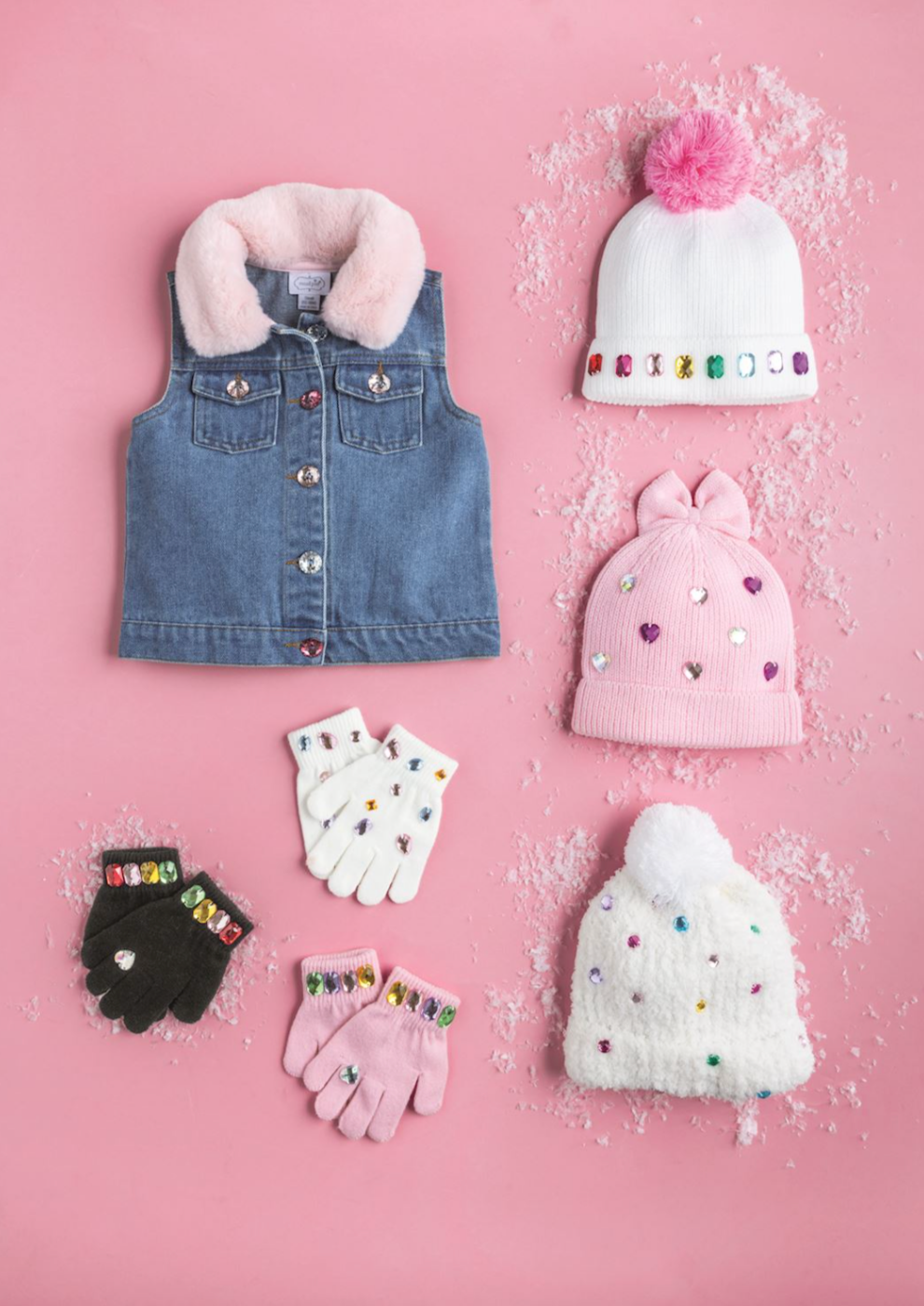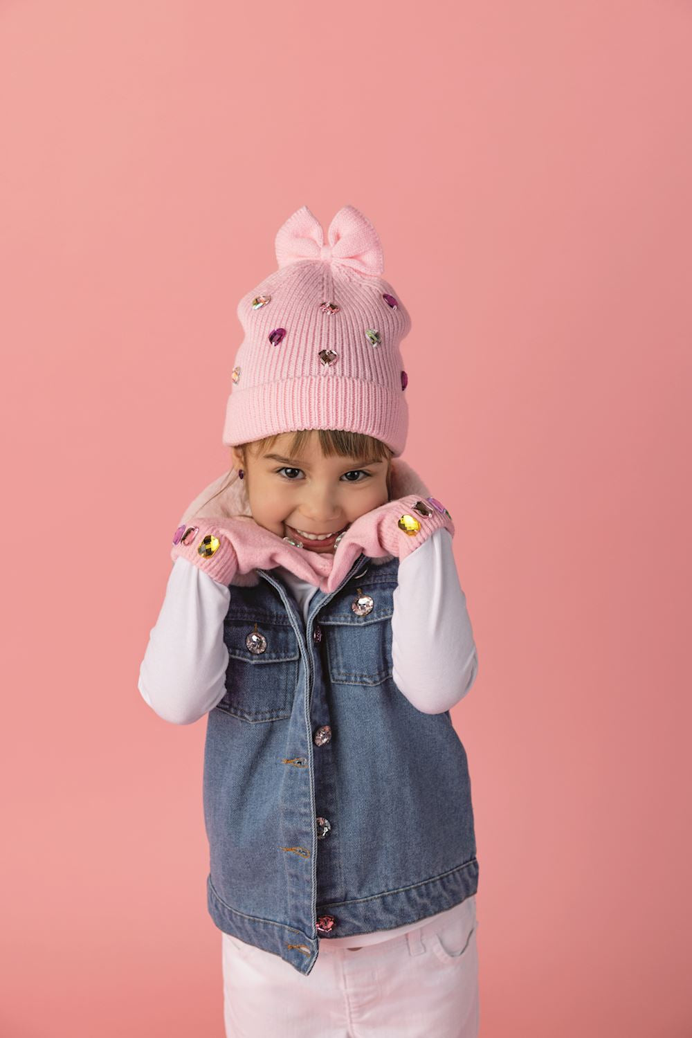 Sweater knit glove with rhinestones at wrist cuffs and ring finger. Ages 3+.