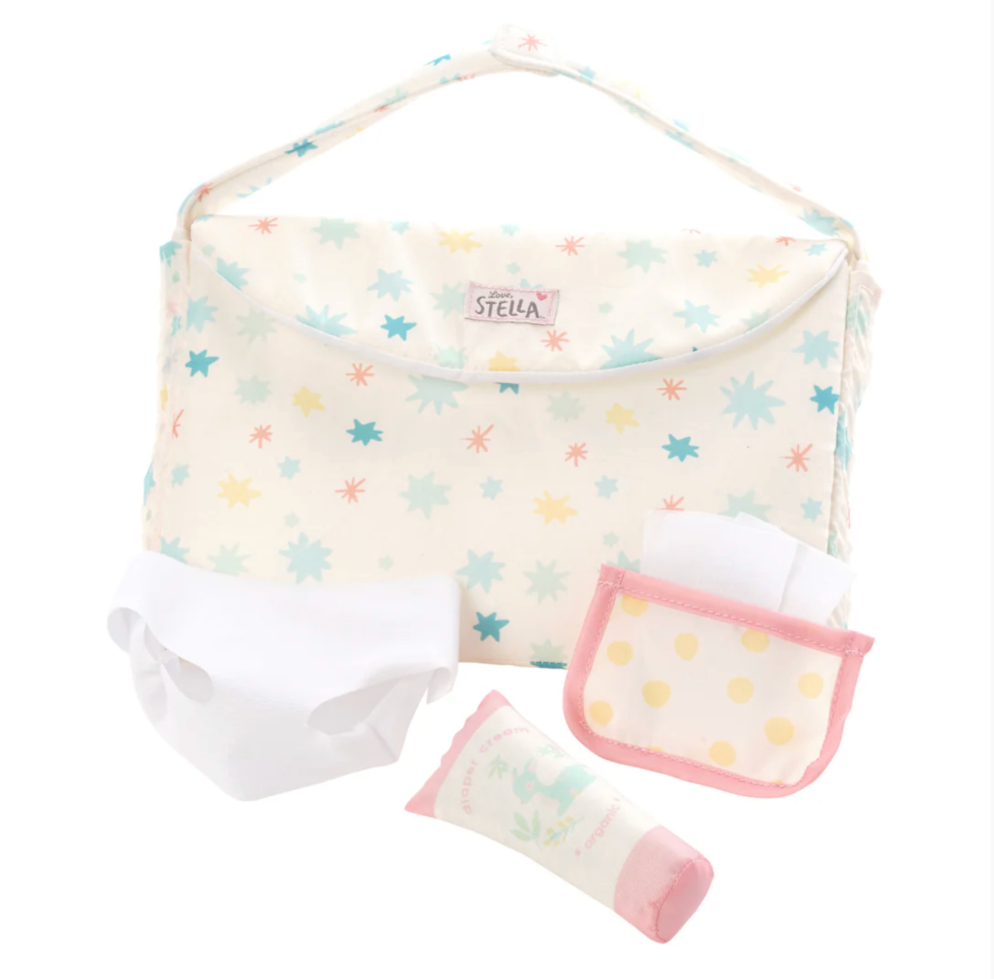 Diaper changing is a breeze with this delightful diaper bag set. Soft doll diaper changing set includes a convertible diaper bag that folds open to a soft changing mat, a diaper, 3 wipes in holder, and a diaper cream tube. Doll sold separately.
