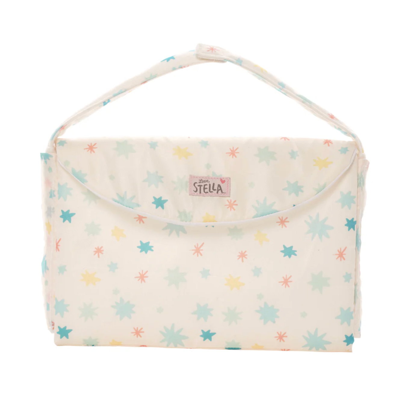 A doll diaper bag and changing mat all in one! Includes convertible changing pad, diaper, wipes + holder, and pretend diaper cream.