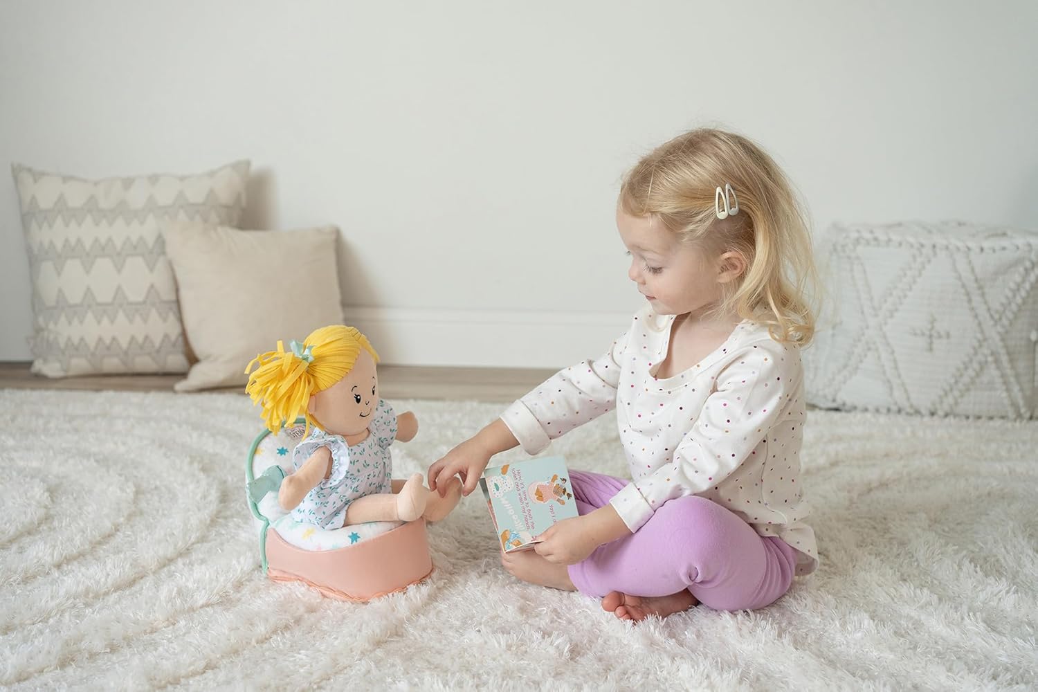 A great way to support the potty-training process. The set includes a potty training-themed board book and a doll-sized soft potty with flushing sounds! Press the handle to activate the flushing sound. Potty features sewn-in non-replaceable batteries. Doll sold separately.