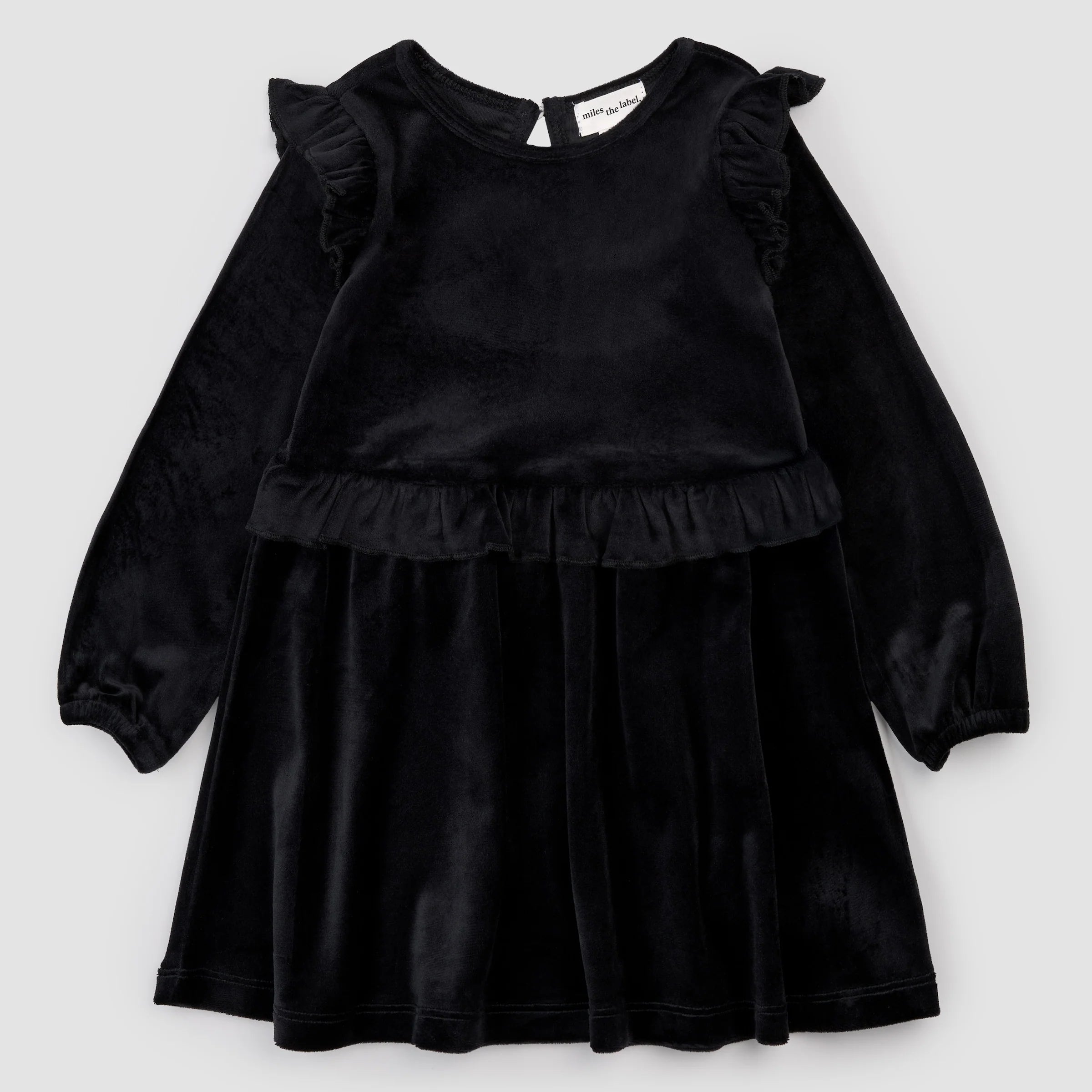 Soft, warm and stylish this long-sleeved dress is made from a chic black velour and is perfect for special occasions. With flutter trim over each sleeve and along the waist, it has a pretty style while looking sophisticated and elegant. The loop button at the back ensures over-the-head dressing is easy and fuss free while keeping the front looking sleek and refined. With a flowy skirt, she’ll love twirling her way through the day.