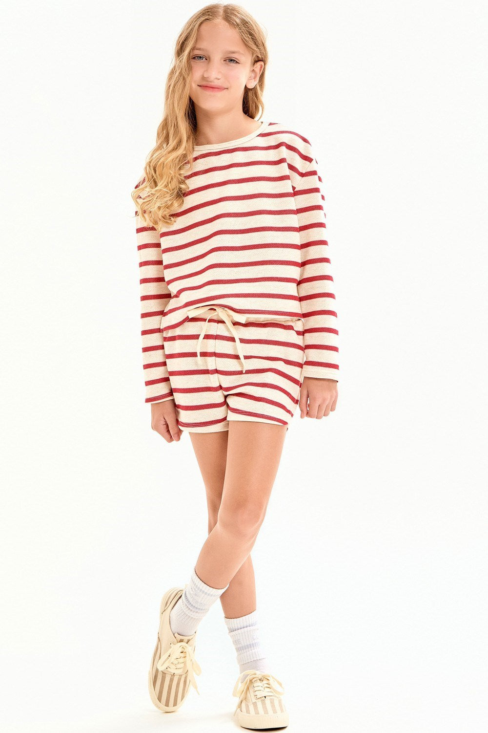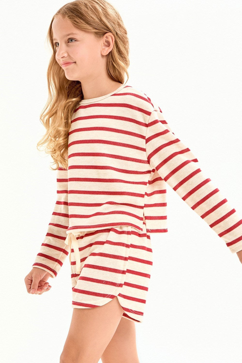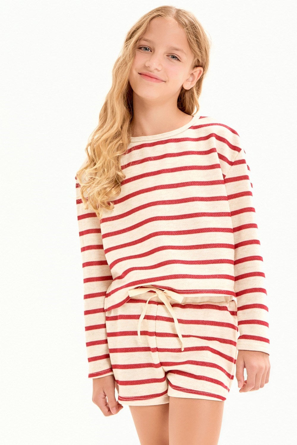 This Game Day Set in bold red features a heavy French terry knit with classic stripes, offering both comfort and style. The crop top includes a round neckline, long sleeves, and side slit hems for ease of movement, while the matching shorts have an elasticized waist and curved hem for a flattering fit. Crafted in the USA from a durable blend of polyester, cotton, and rayon, this two-piece set balances breathability with structure, making it ideal for active or casual wear.
