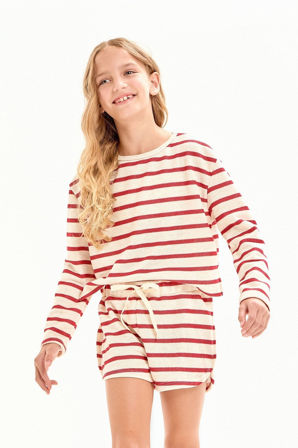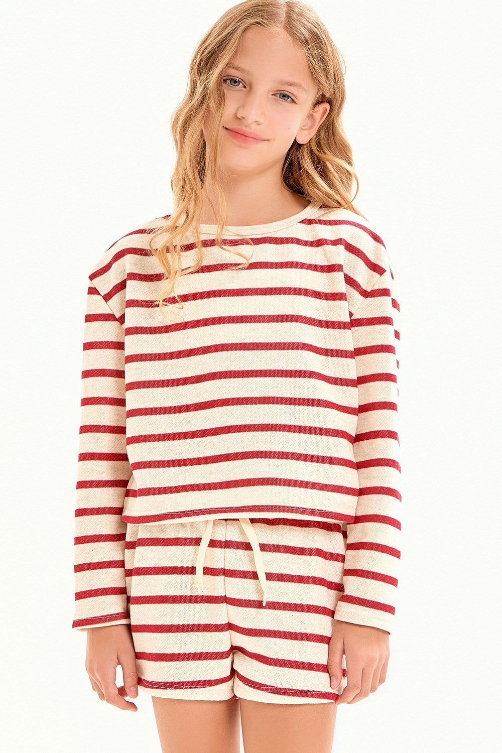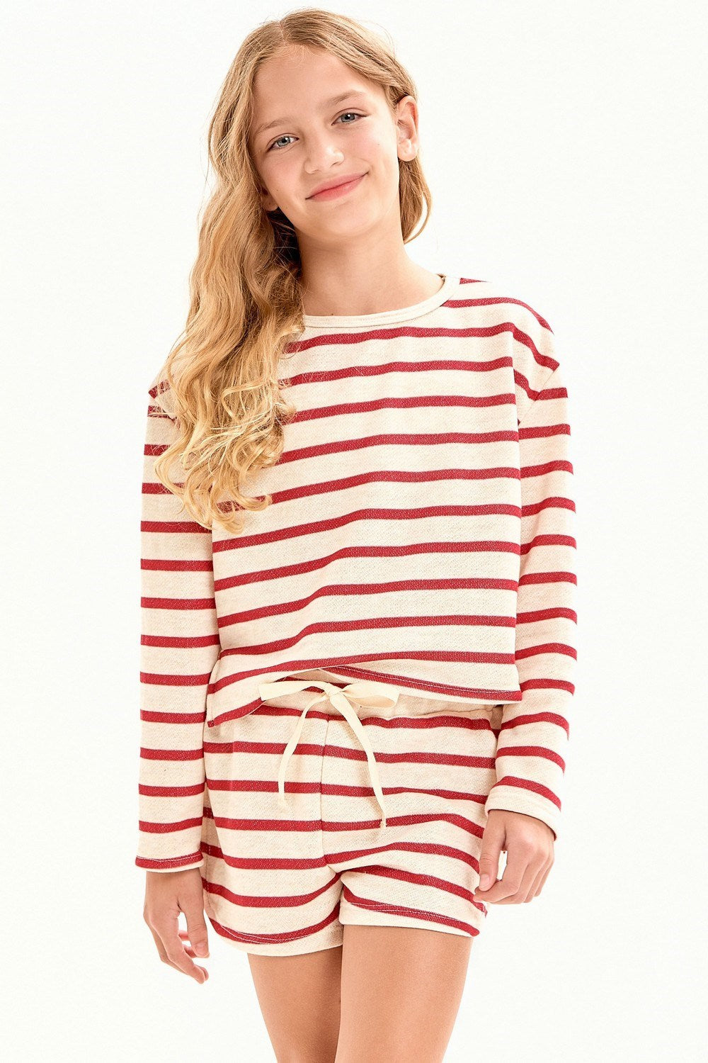 This Game Day Set in bold red features a heavy French terry knit with classic stripes, offering both comfort and style. The crop top includes a round neckline, long sleeves, and side slit hems for ease of movement, while the matching shorts have an elasticized waist and curved hem for a flattering fit. Crafted in the USA from a durable blend of polyester, cotton, and rayon, this two-piece set balances breathability with structure, making it ideal for active or casual wear.