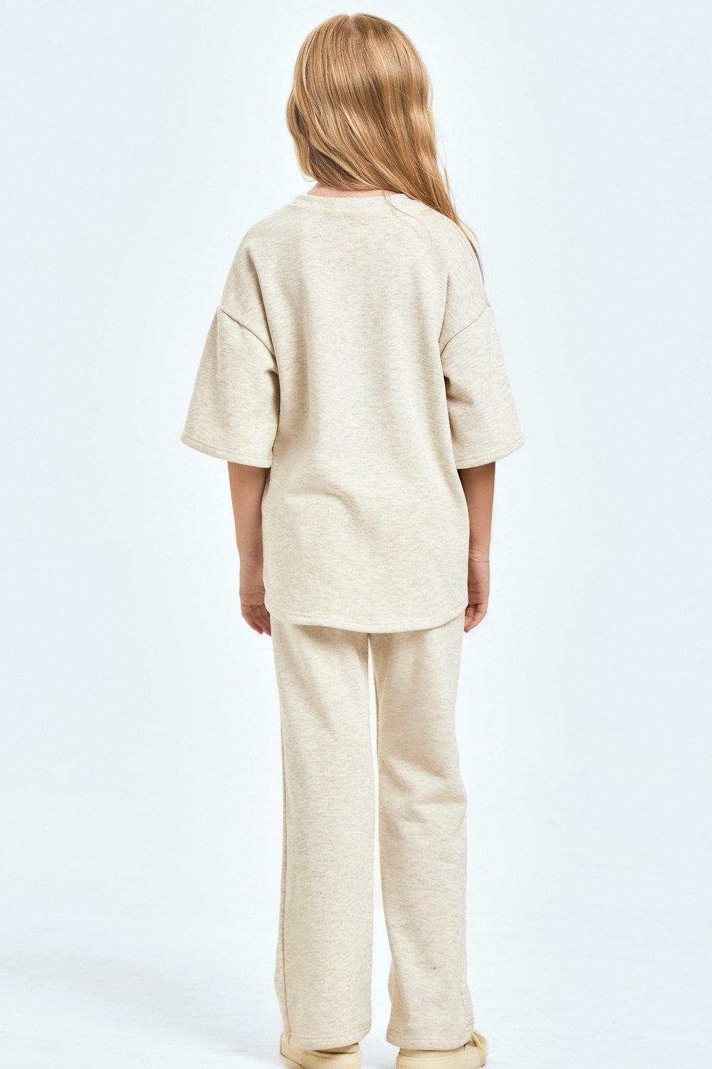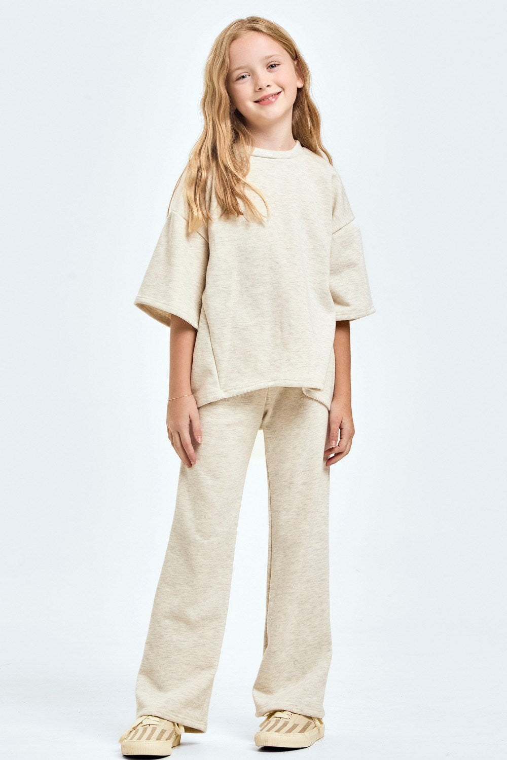 Crafted from a soft cotton French terry knit, this top and pants set offers exceptional comfort and durability. The top features a dropped shoulder short sleeve design with a knit rib round neckline and a stylish high-low hem, promoting ease of movement. Complemented by wide-leg pants with a contrasting waistband, the set combines relaxed fit with subtle detail for a refined look. Made in the USA from 92% cotton and 8% spandex, it ensures breathability and gentle stretch, perfect for everyday wear.