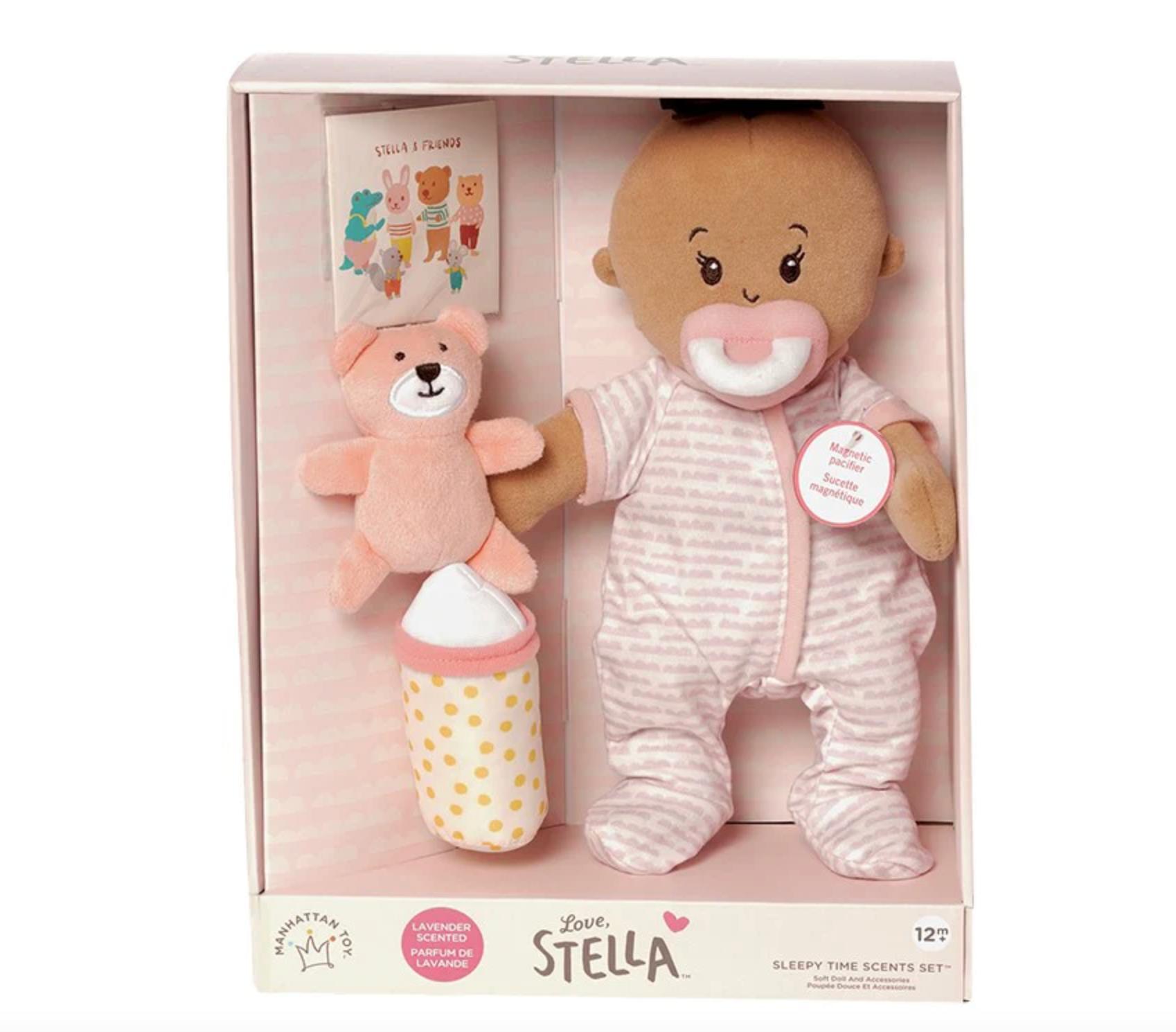 The Love, Stella Sleepy Time dolls are the perfect size for holding, hugging, and nurturing role play to foster social and emotional development. Dolls are 100% soft with a soothing light lavender scent. The doll's bottom is lightly weighted and designed to sit unassisted - perfect for playtime! Sleepy Time doll has embroidered features, fabric hair, a plump tummy, and a cute little belly button. The set includes a signature magnetic pacifier, a magnetic bottle, a teddy bear companion, and a mini paper bedtime picture book. Clothes and diaper are removable and feature hook-and-loop closures for supporting elementary dressing skills.