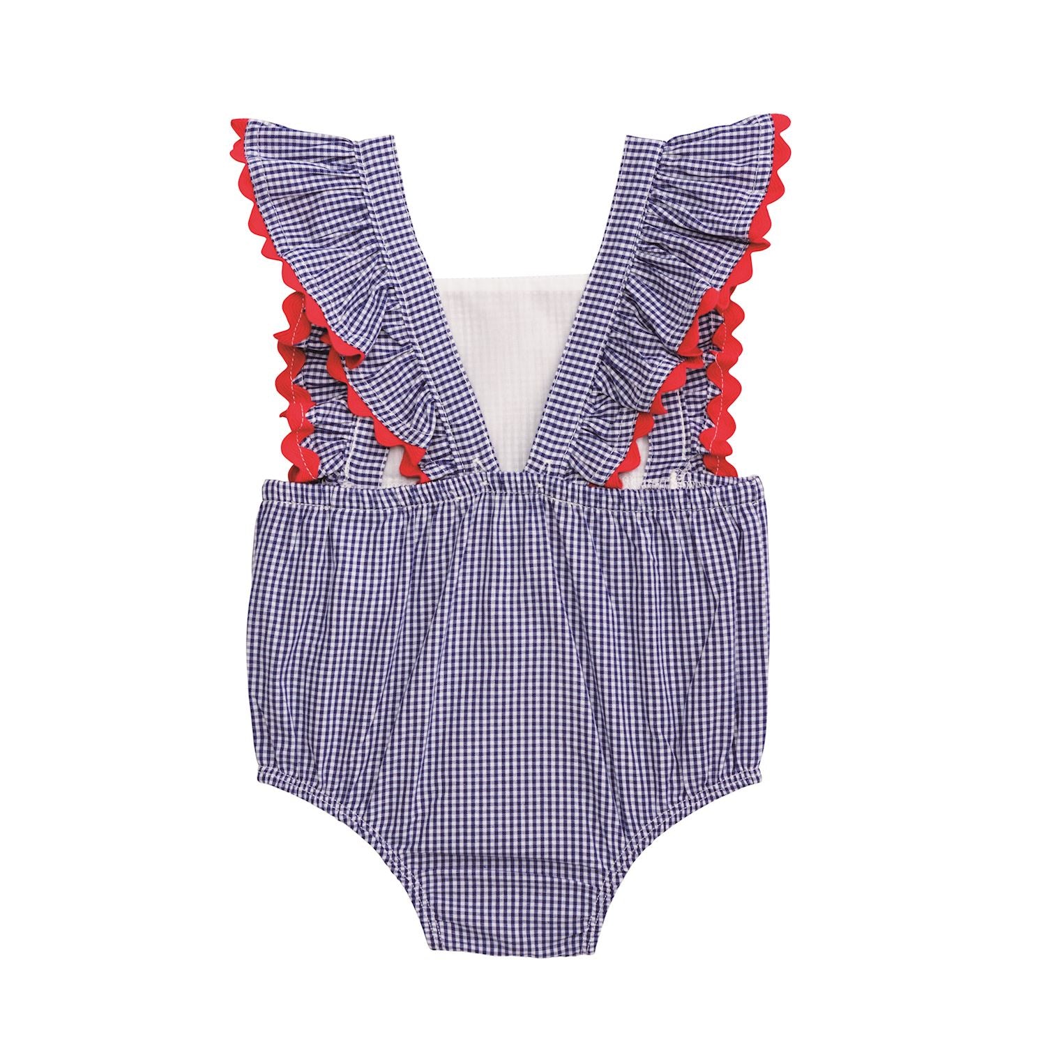 The Gingham Ric Rac Bubble and Headband Set is a charming 2-piece ensemble perfect for your little one. The gingham sun bubble showcases delightful ric-rac trimmed ruffle shoulder straps, adding a touch of whimsy to the design. Convenient inner leg snaps ensure easy dressing and diaper changes. Accompanying the bubble is a coordinating ric-rac bow headband, completing the adorable look. Designed for sizes 3-6 months, the body of the bubble is crafted from 100% cotton for breathability and comfort, while the lining is a blend of 80% polyester and 20% cotton for added durability. The headband is made from 100% cotton, ensuring a soft and gentle fit. Ideal for sunny days and special occasions, this set combines style and practicality for your baby's wardrobe.