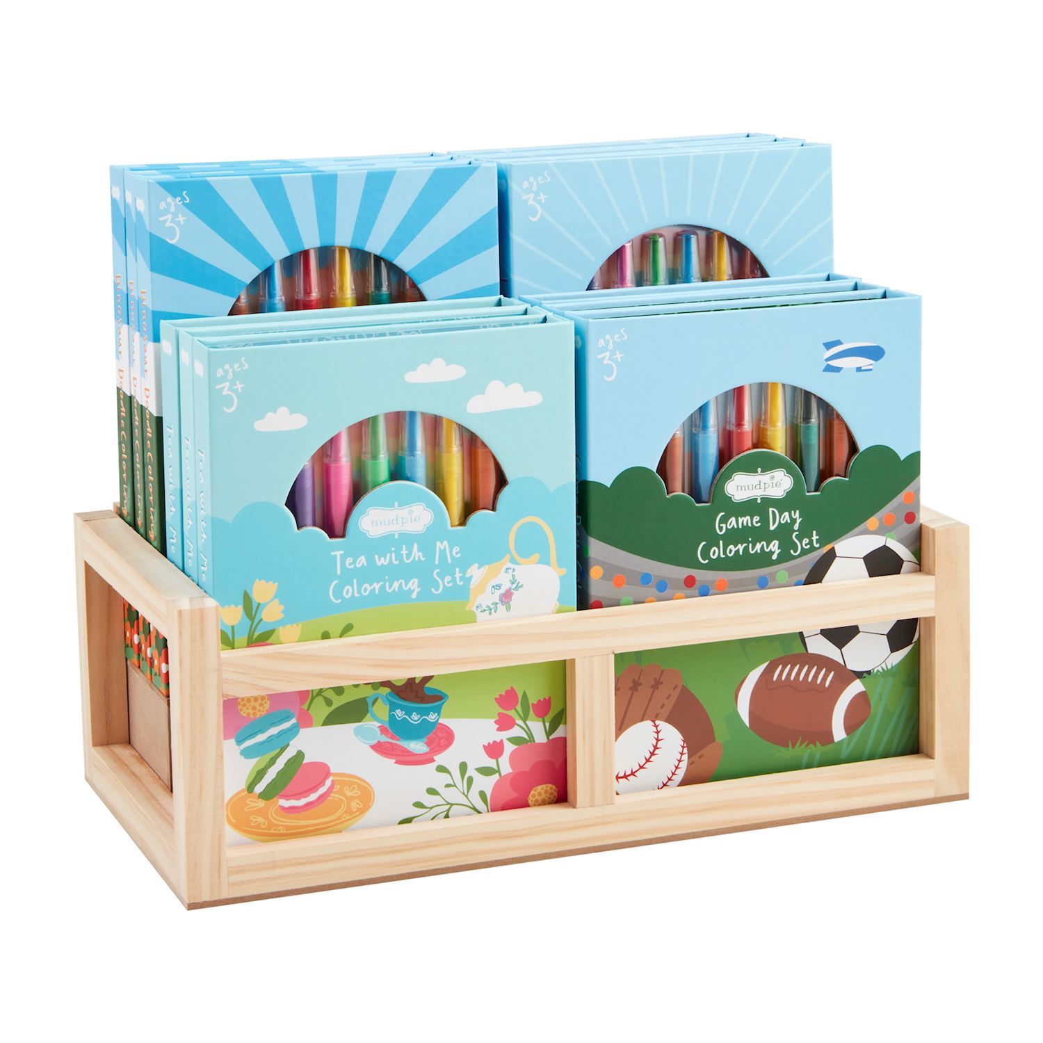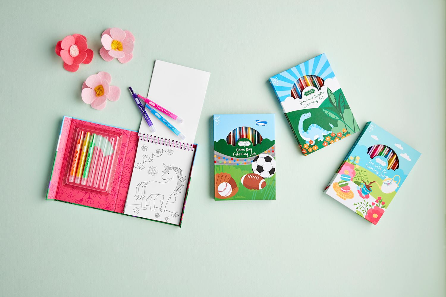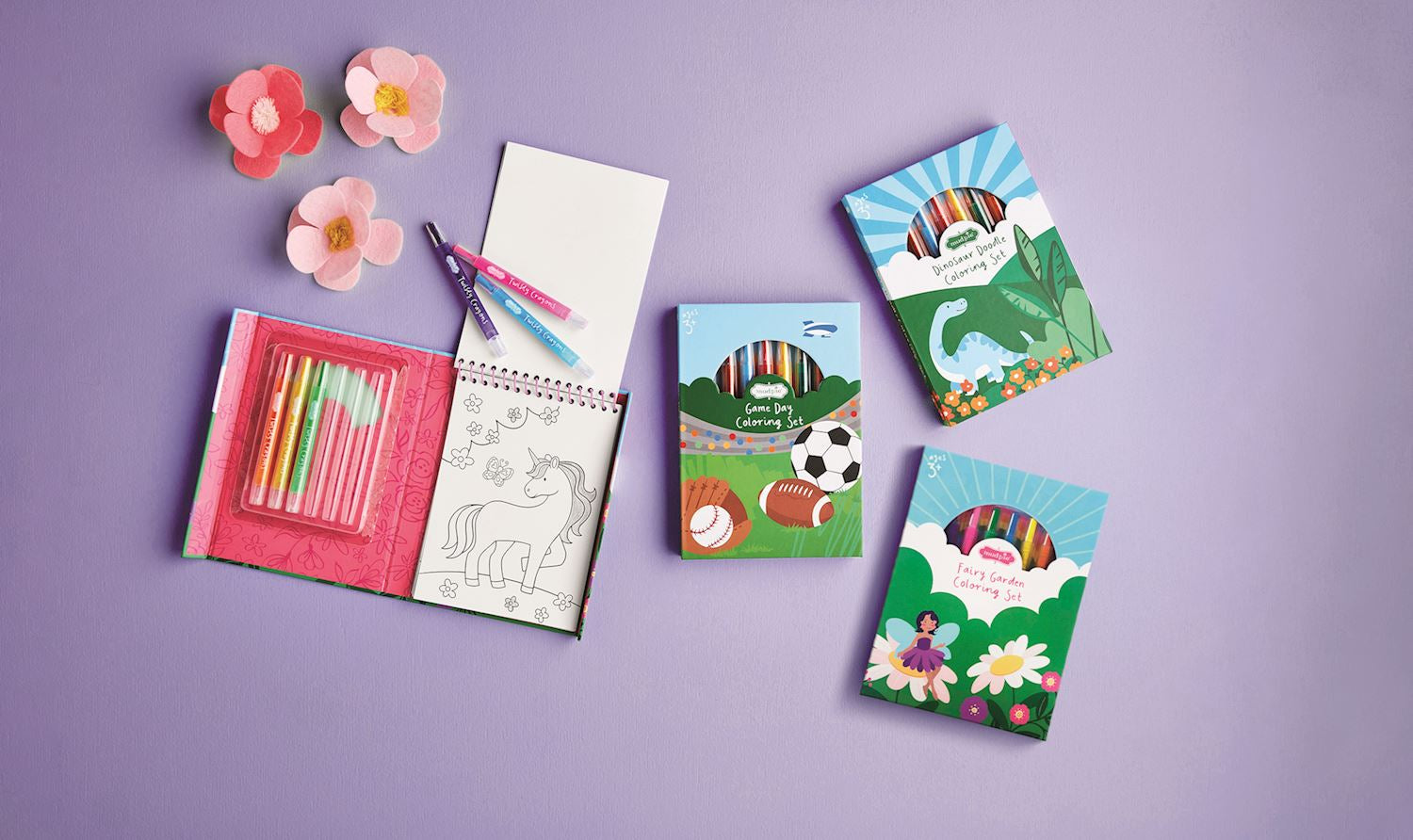 Spiral coloring book comes with pack of six twisty crayons in paper wrapped box with magnetic closure. Ages 3+.