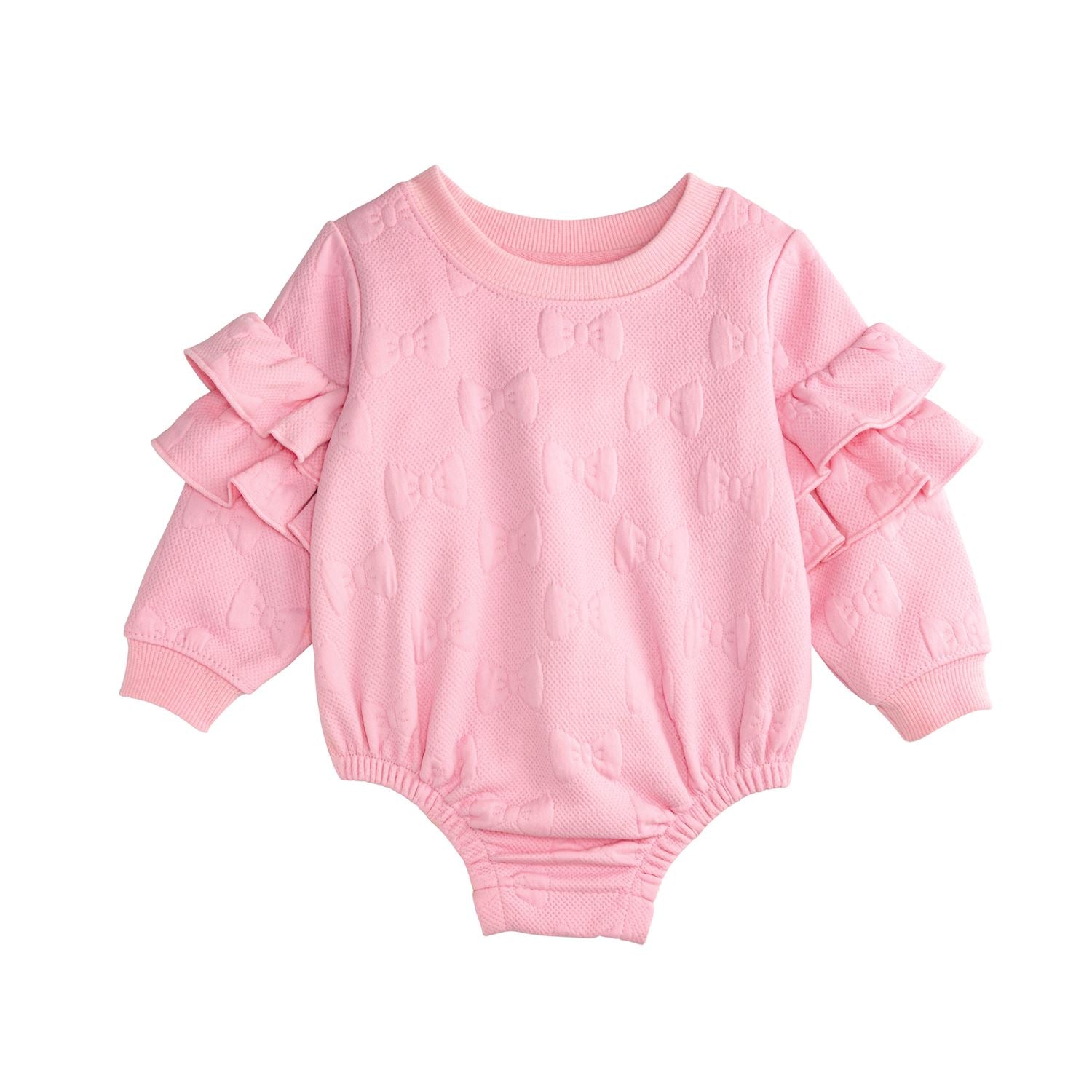 The Quilted Bow Sweatshirt Baby Bubble is a charming and cozy addition to your little one's wardrobe. This adorable bubble features a unique quilted bow jacquard design that adds a touch of elegance and style. The ruffle sleeves provide a playful and feminine flair, while the ribbed neckline and sleeve openings ensure a comfortable fit. Designed with practicality in mind, the inner leg snaps make diaper changes quick and easy. Crafted from a soft and durable blend of 98% polyester and 2% spandex, this bubble offers both comfort and flexibility for your baby. Available in size 0-3 months, it's perfect for keeping your baby snug and stylish.