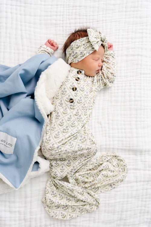 The easiest tie-bottom outfit for day or night. Made for hassle free diaper changes and gentle dressing, I designed this with a button-down front and tie bottom for simple closure (no more snaps at 2am!). Fold over wrist cuffs are the most thoughtful finishing touch. Headband sold separate.