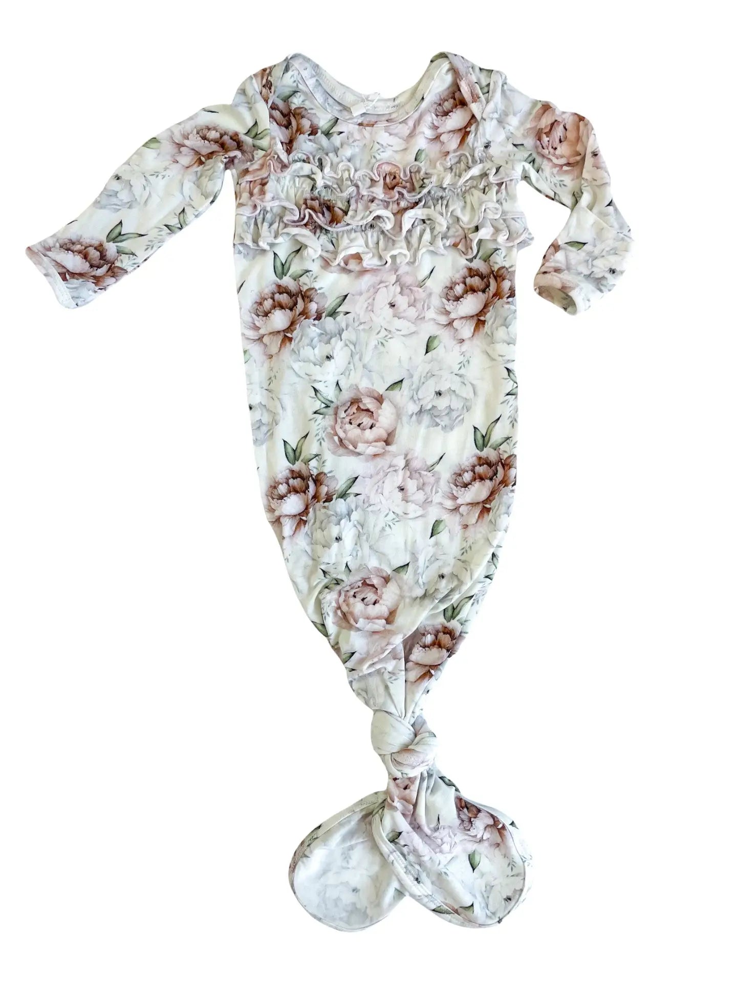Floral Dreams Knot Gown πΈπ€ Soft, elegant, and timeless the Floral Dreams Knot Gown wraps your little one in gentle luxury. Featuring delicate watercolor peonies in blush, ivory and taupe tones, this dreamy floral print captures the beauty of sweet newborn snuggles. Crafted from our signature buttery soft viscose from bamboo, this gown is breathable, stretchy, and kind to sensitive skin. Designed with fold over no scratch cuffs, pull down shoulders for easy dressing, and a tie-bottom for quick diaper changes. Sweet ruffle detailing across the chest adds a feminine, classic touch that makes this piece extra special. β¨ Pairs perfectly with the matching Floral Dreams Zip Footie, Toddler Set, Swaddle Blanket and Mommy Robe for a beautiful coordinated look.