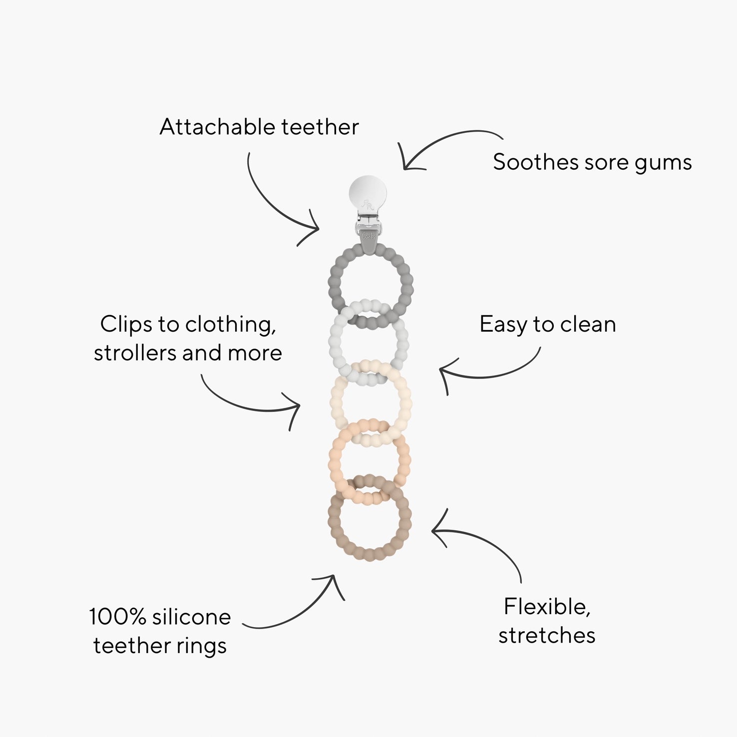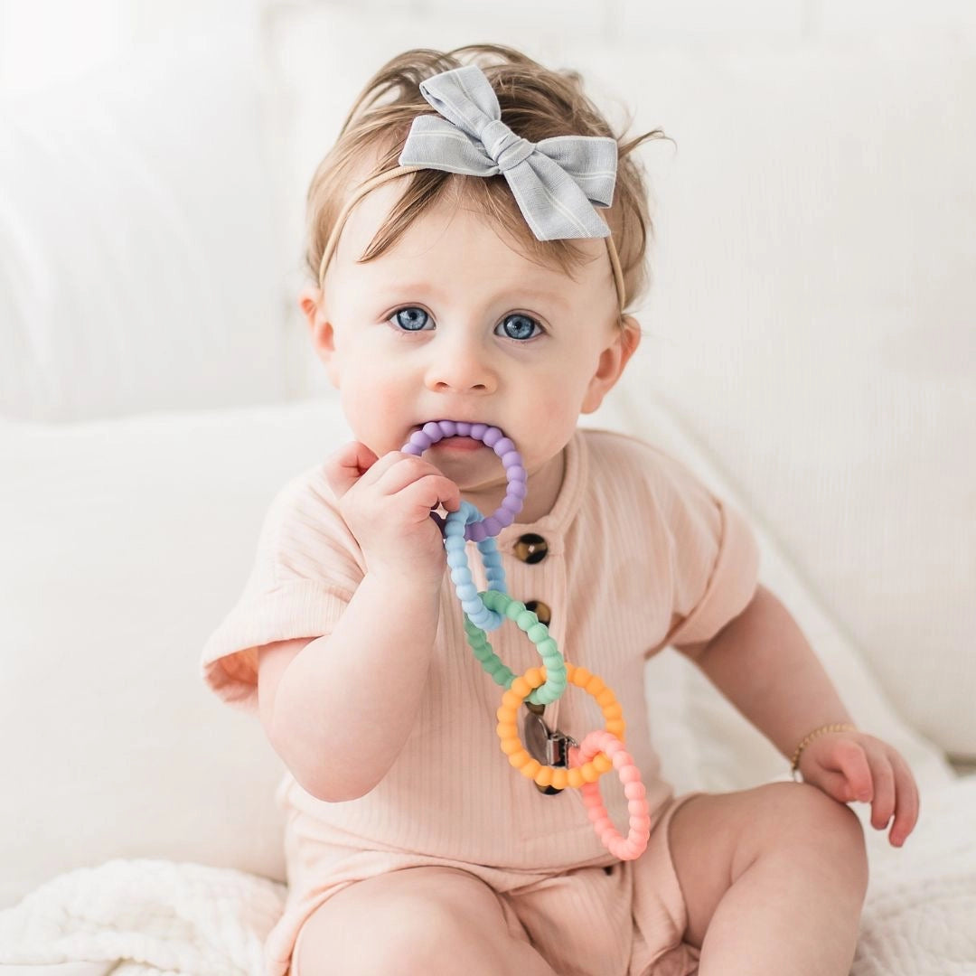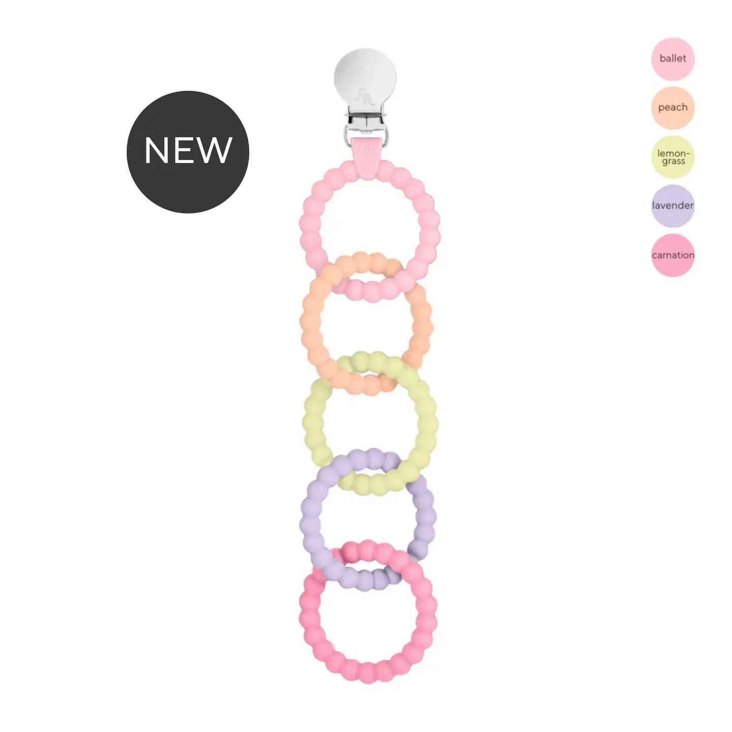The Cutie Clinks are an attachable teether designed to help babies reach developmental milestones through bilateral coordination, sensory exploration, and oral and fine motor skills. The beaded design provides comfort for sore gums, while the fun colors stimulate curiosity and encourage play. The Cutie Clinks clip easily to clothing, strollers, and more; finally, a teether you won’t lose! PATENTED DESIGN CA Patent No. 207305 US Patent Pending