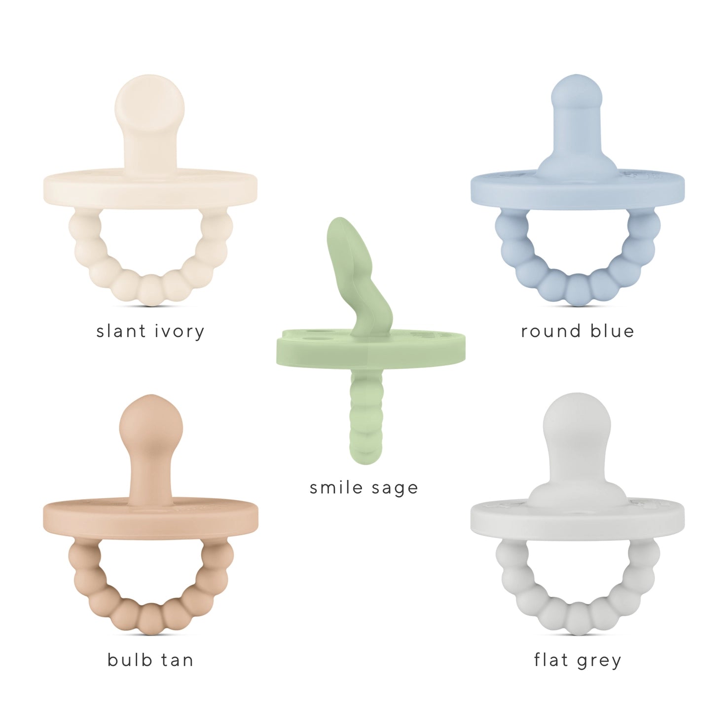 Finding the right pacifier for your baby can be overwhelming and expensive. That's why we created the ultimate Pacifier Starter Kit. It features 5 Cutie PAT nipple styles for your baby to explore. We've taken the hassle out of pacifier selection, making it a simple and affordable process for parents. The Cutie PAT (Pacifier And Teether) is a multifunctional 2-in-1 patented design. The nipple was created to soothe, while the teether was developed to aid in teething relief. All Cutie PAT styles are a safe, one-piece design made out of 100% medical-grade silicone. They have a large shield for teething, and large holes for safe breathing. The teether handle provides comfort for sore gums, and also makes it easy for baby to hold and place in their mouth. The Cutie PAT Starter Kit includes the following 5 nipple styles: Smile 0M+: The Cutie PAT Smile is an Orthodontic Pro pacifier and teether that was designed and patented by a Board Certified Pediatric Dentist. It has an ergonomic shape and was designed to promote natural oral development and to help protect against orthodontic issues such as open bite, crossbite, and increased over jet. The Cutie PAT Smile 0M+ has a soft orthodontic shaped nipple, and can be used by newborns up until weaning. The bite resistant nipple is safe for babies with and without teeth. Flat 0M+: The Cutie PAT Flat 0M+ has a soft orthodontic shaped nipple and was designed to promote natural oral development. It can be used by newborns up until weaning. The bite resistant nipple is safe for babies with and without teeth. Slant 0-6M: The Cutie PAT Slant 0-6M has a soft orthodontic shaped nipple that is flattened and was designed to promote natural oral development. It can be used by newborns up until 6 months. Once baby develops teeth, transition to a 0M+ or a Stage 2 Cutie PAT, for babies with or without teeth. Round 0-6M: The Cutie PAT Round 0-6M has a soft round nipple and can be used by newborns up until 6 months. Once baby develops teeth, transition to a 0M+ or a Stage 2 Cutie PAT, for babies with or without teeth. Bulb 0-6M: The Cutie PAT Bulb 0-6M has a soft cherry-shaped nipple and can be used by newborns up until 6 months. Once baby develops teeth, transition to a 0M+ or a Stage 2 Cutie PAT, for babies with or without teeth.