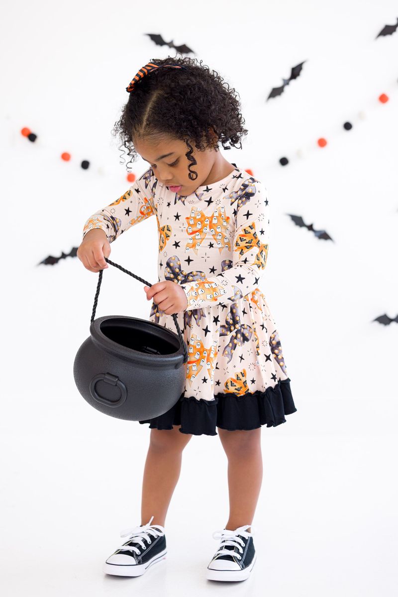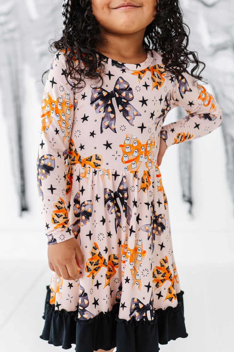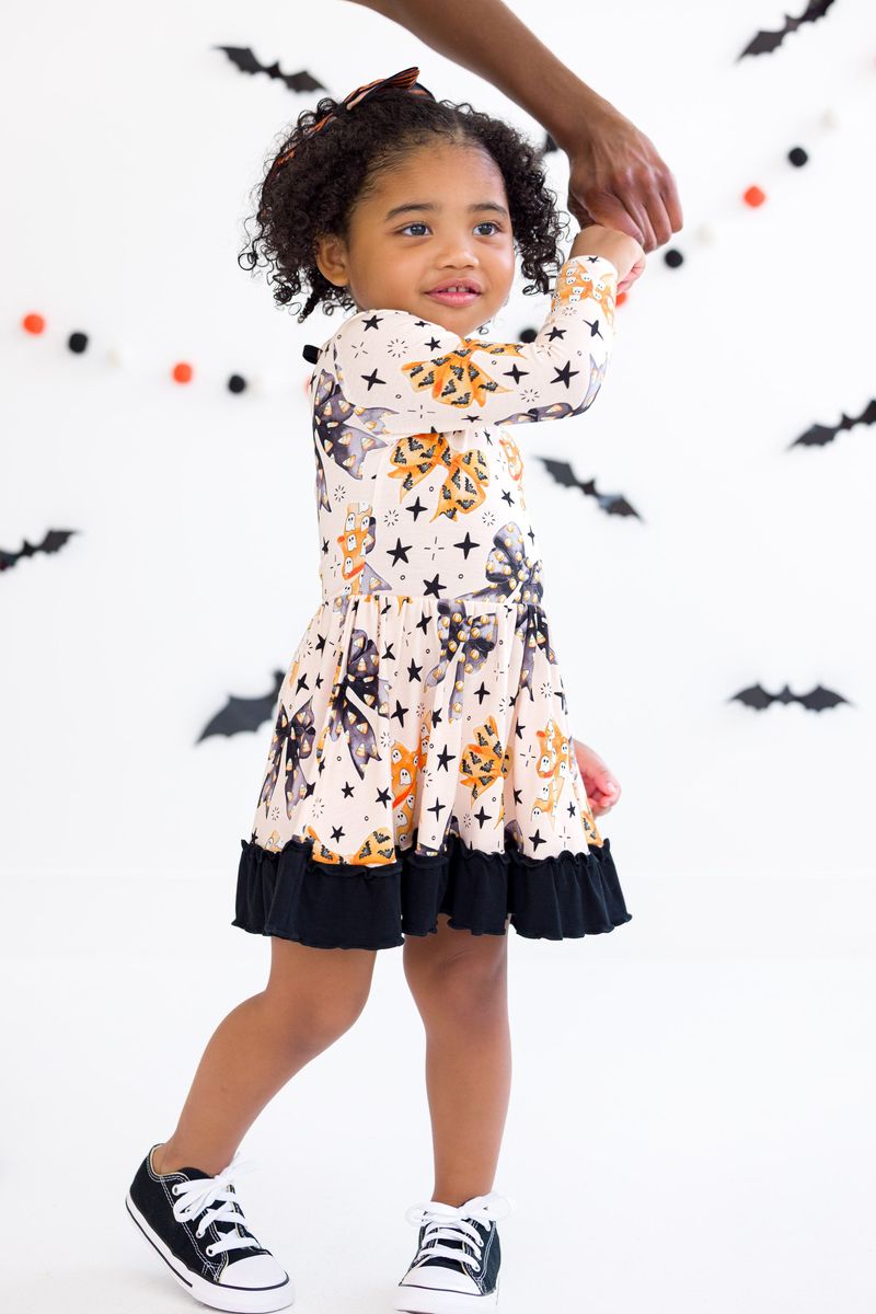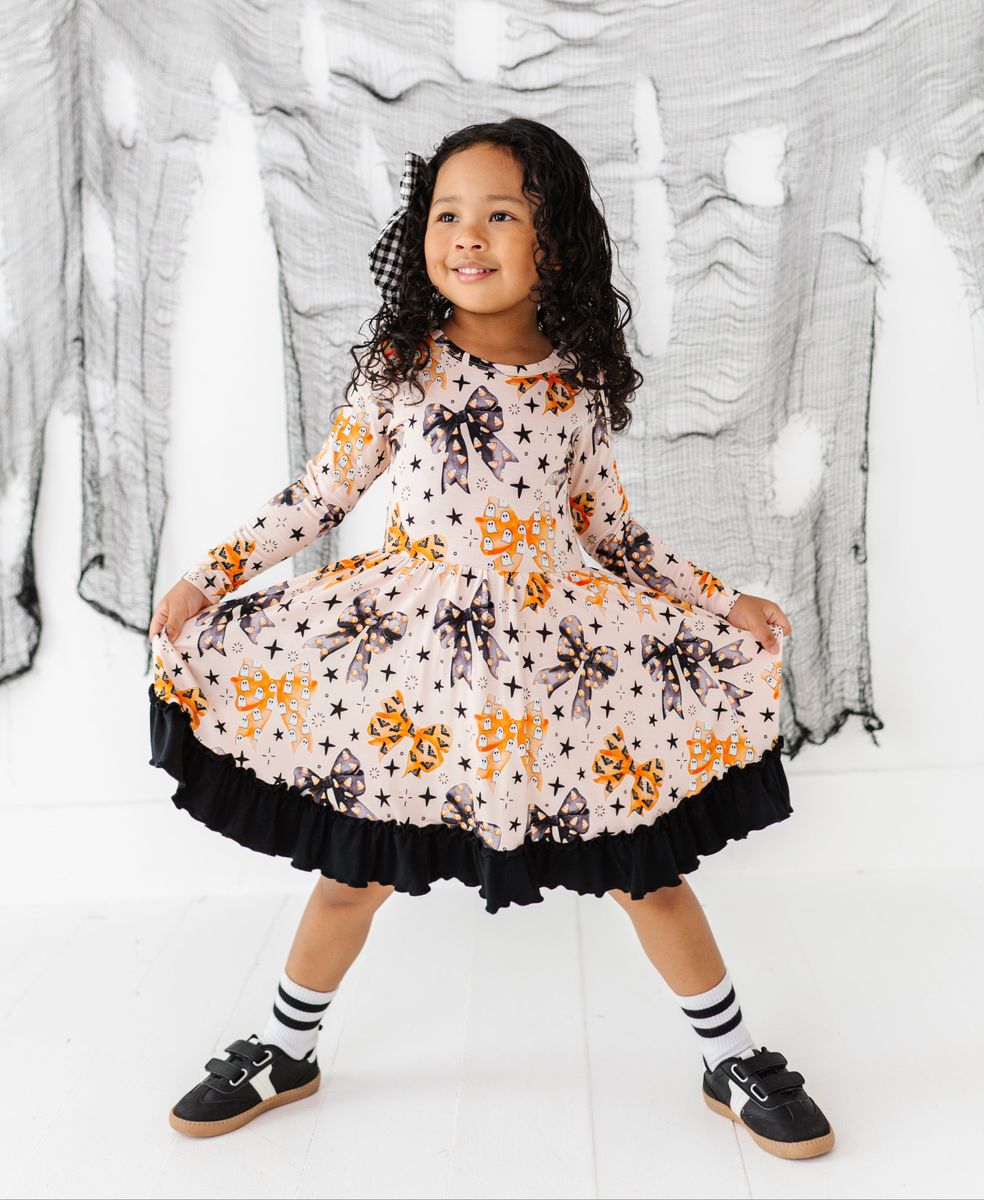 Spooky just got stylish! This Halloween dress features an all-over print of playful pumpkin bows, scattered stars, and a perfectly festive palette. The dramatic layered ruffle hem gives every spin serious flair. Made from our ultra-soft bamboo blend, it’s breathable, stretchy, and made for comfort from the classroom to the costume party.