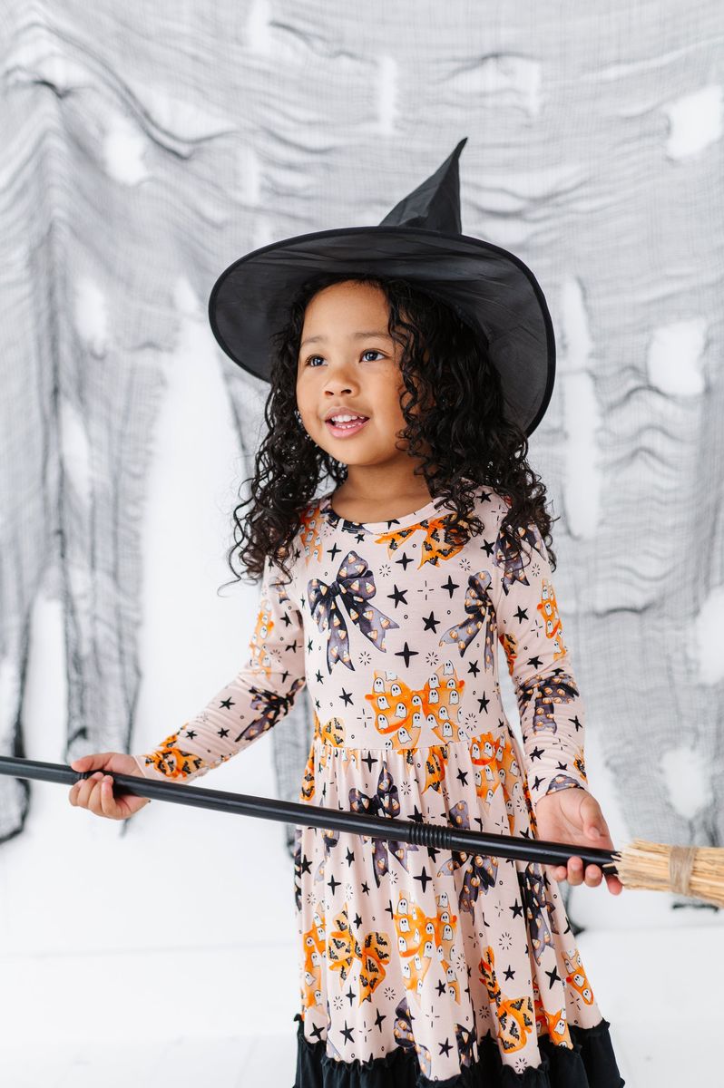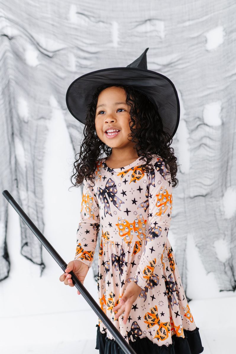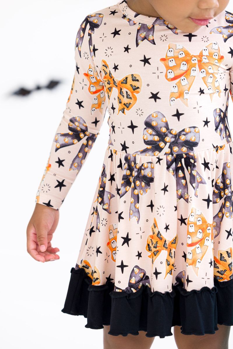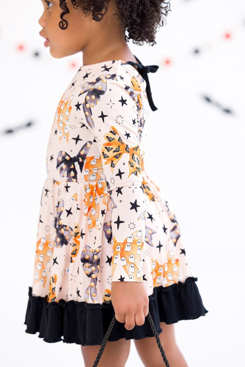 Spooky just got stylish! This Halloween dress features an all-over print of playful pumpkin bows, scattered stars, and a perfectly festive palette. The dramatic layered ruffle hem gives every spin serious flair. Made from our ultra-soft bamboo blend, it’s breathable, stretchy, and made for comfort from the classroom to the costume party.