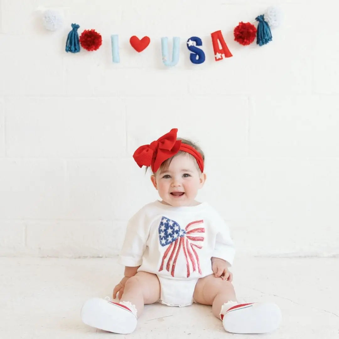 The Patriotic Sequin Bow Patch Short Sleeve Romper is a fun and festive romper for babies celebrating the 4th of July or to show patriotic spirit any day! Features: * Romper Color: White * Patch Color: Red, white and blue sequins with white felt outline * Material: 100% Cotton * Features: Tagless inside neck label for an itch-free wear; 3 snap closure; cuffed sleeves; trendy bubble style * Fit: Infant Unisex * Care: Machine washable, wash inside out, lay flat to dry Each romper is hand pressed with love in our hometown warehouse.