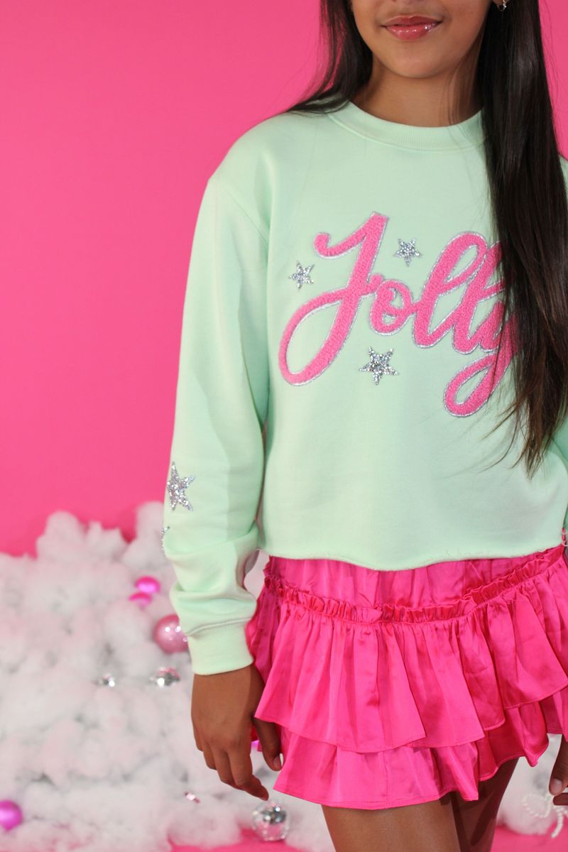 Fleece sweatshirt for tween girls featuring the phrase 'Jolly' in chenille embroidery and multiple stars in rhinestone details.