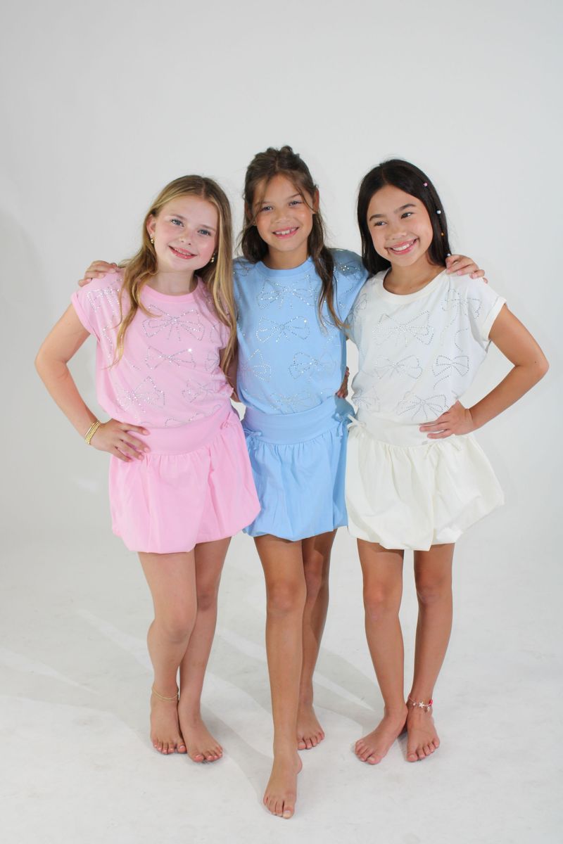 Tween girls cotton top adorned with multiple rhinestones bows.