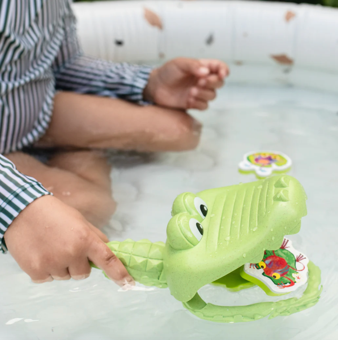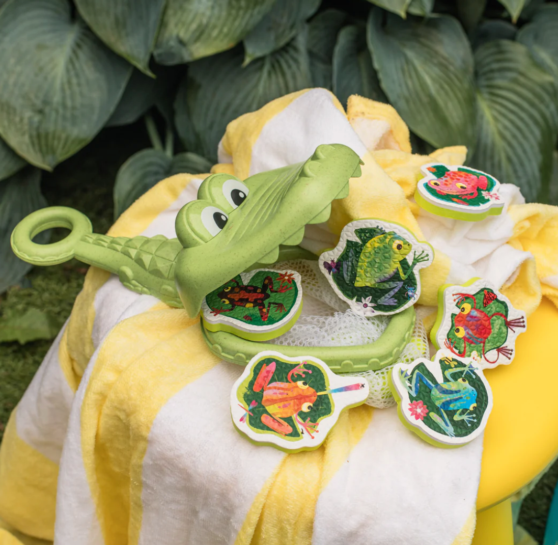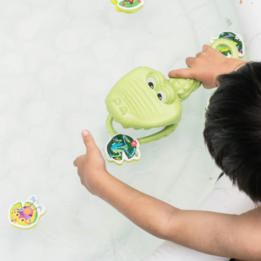 - Includes 1x snappy toothed, bioplastic crocodile, 7x floaty foam frogs