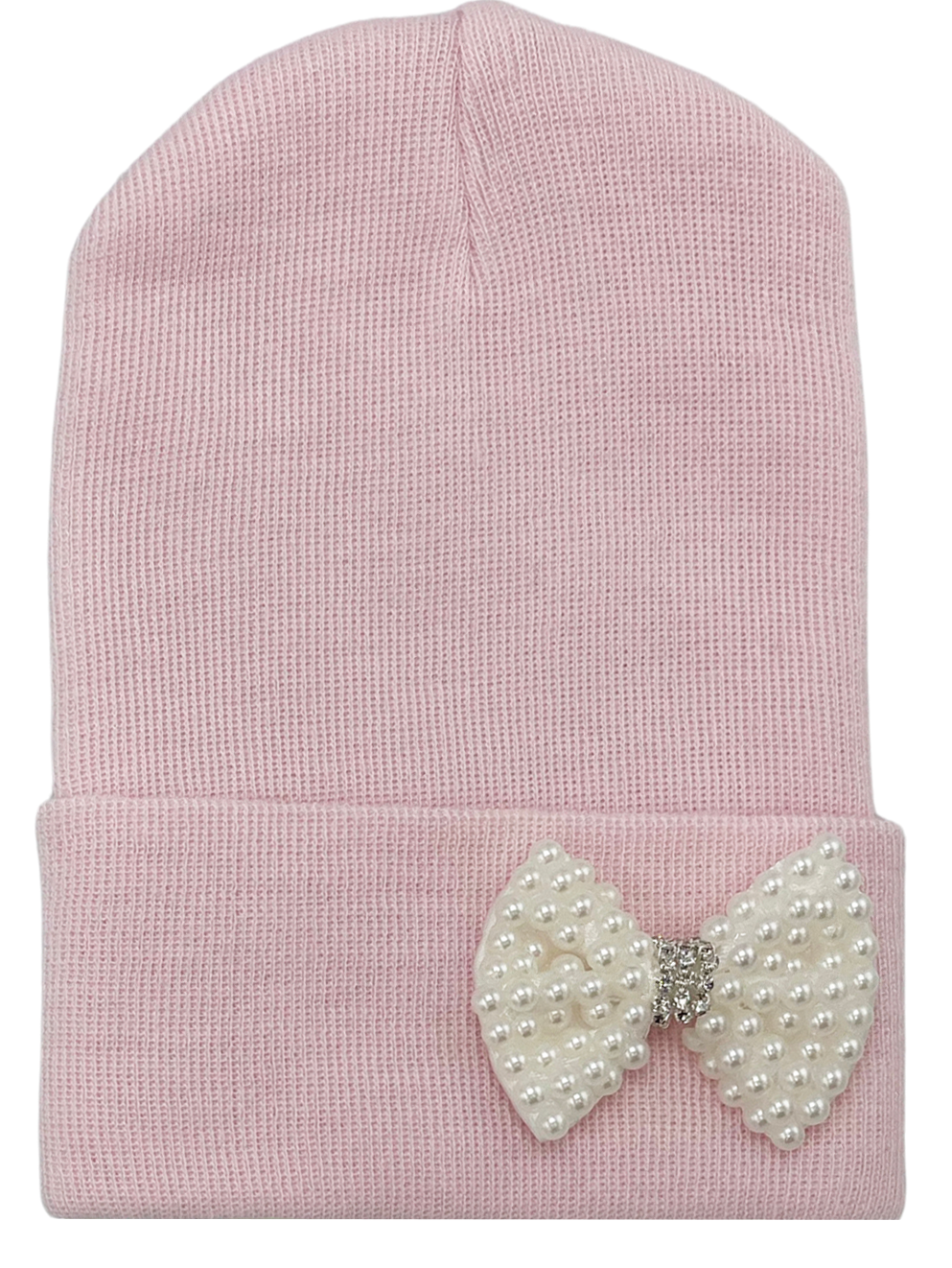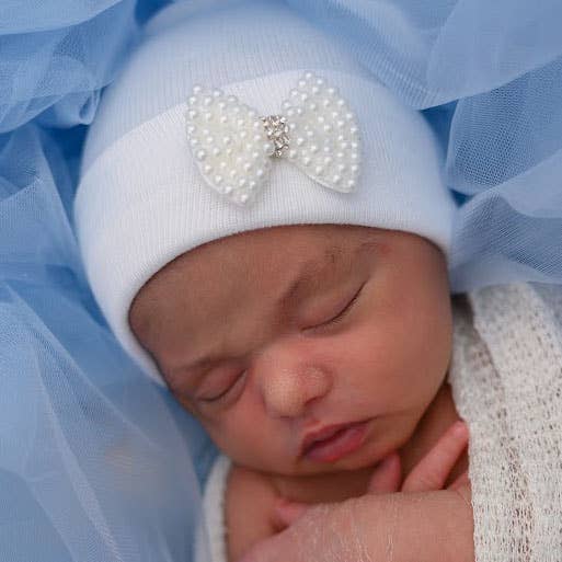 White or Pink Newborn Girl Hospital Hat with MINI Pearl and Rhinestone Center Bow