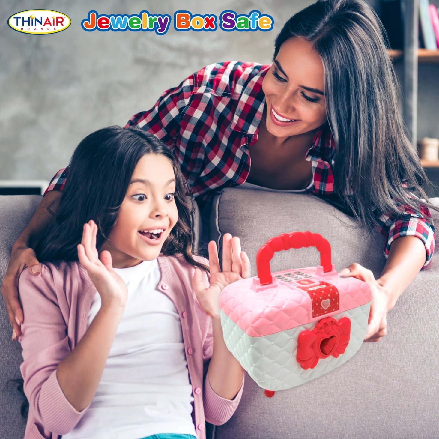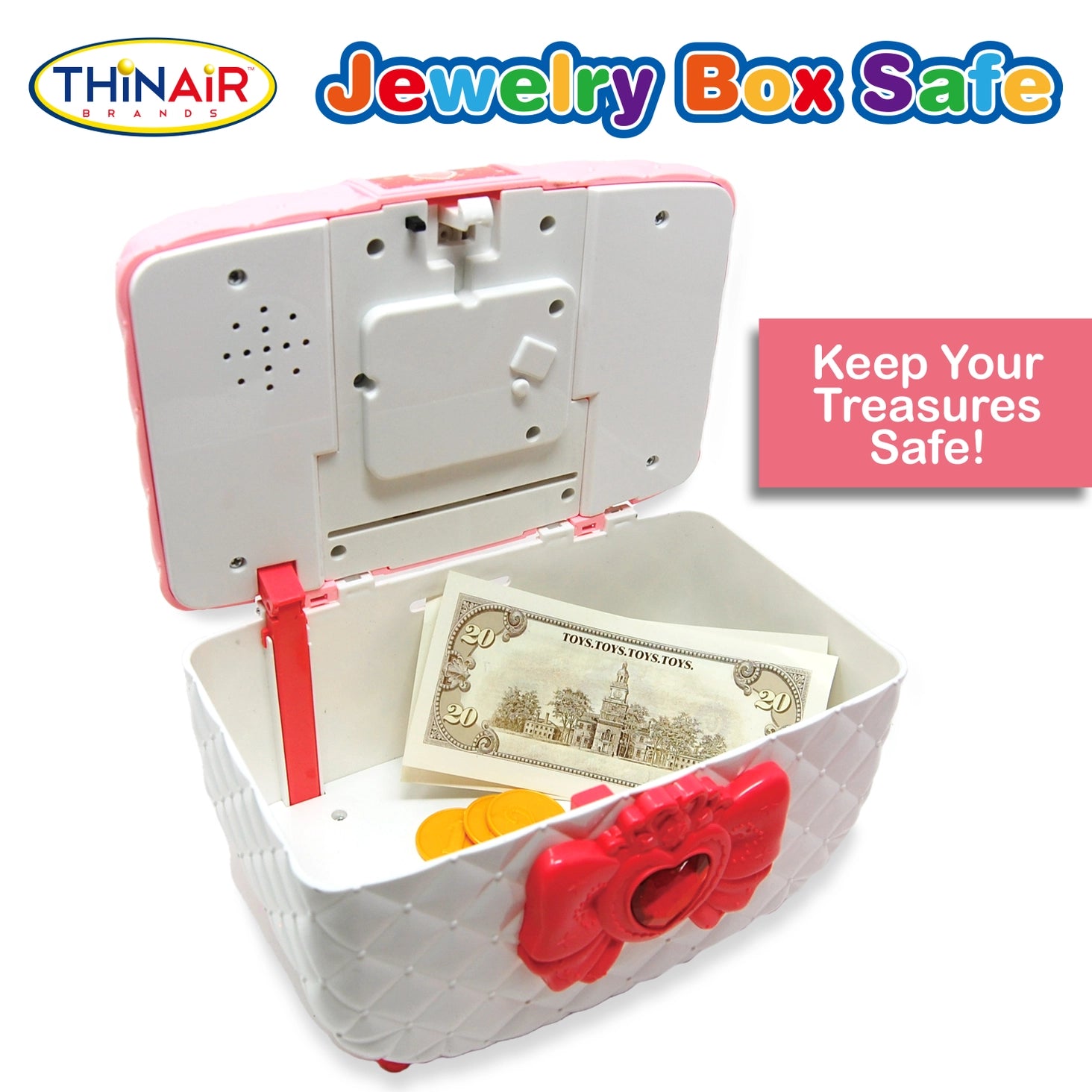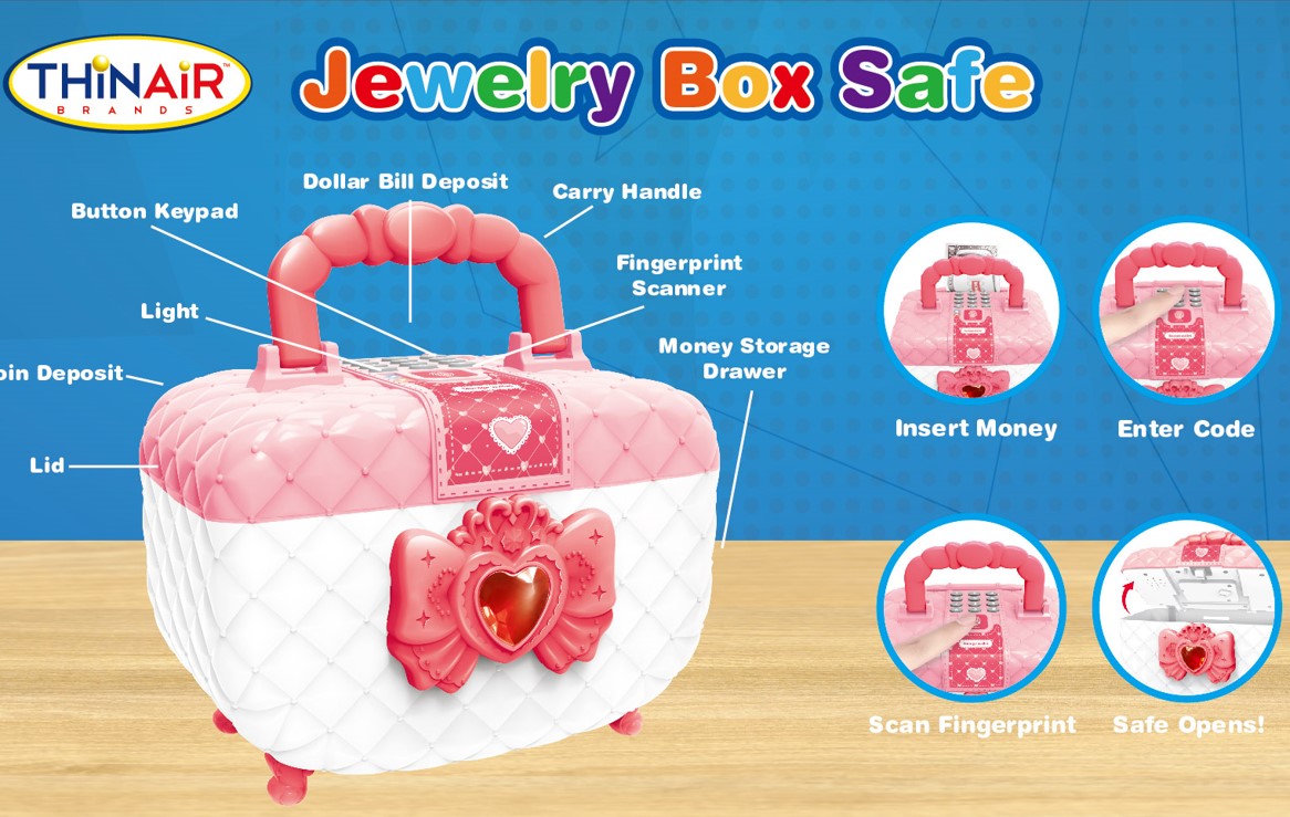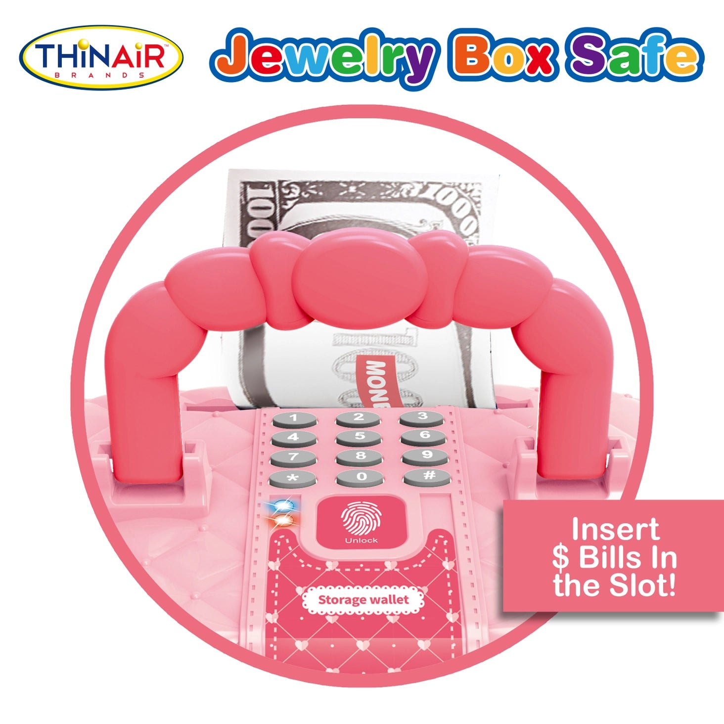 Jewelry Box Safe Ages 3+ Adorable design! Keypad with customizable secret code to keep treasures safe Includes 6 play coins and paper bill Coin and Bill deposit slots Required 2 AA Batteries, not included