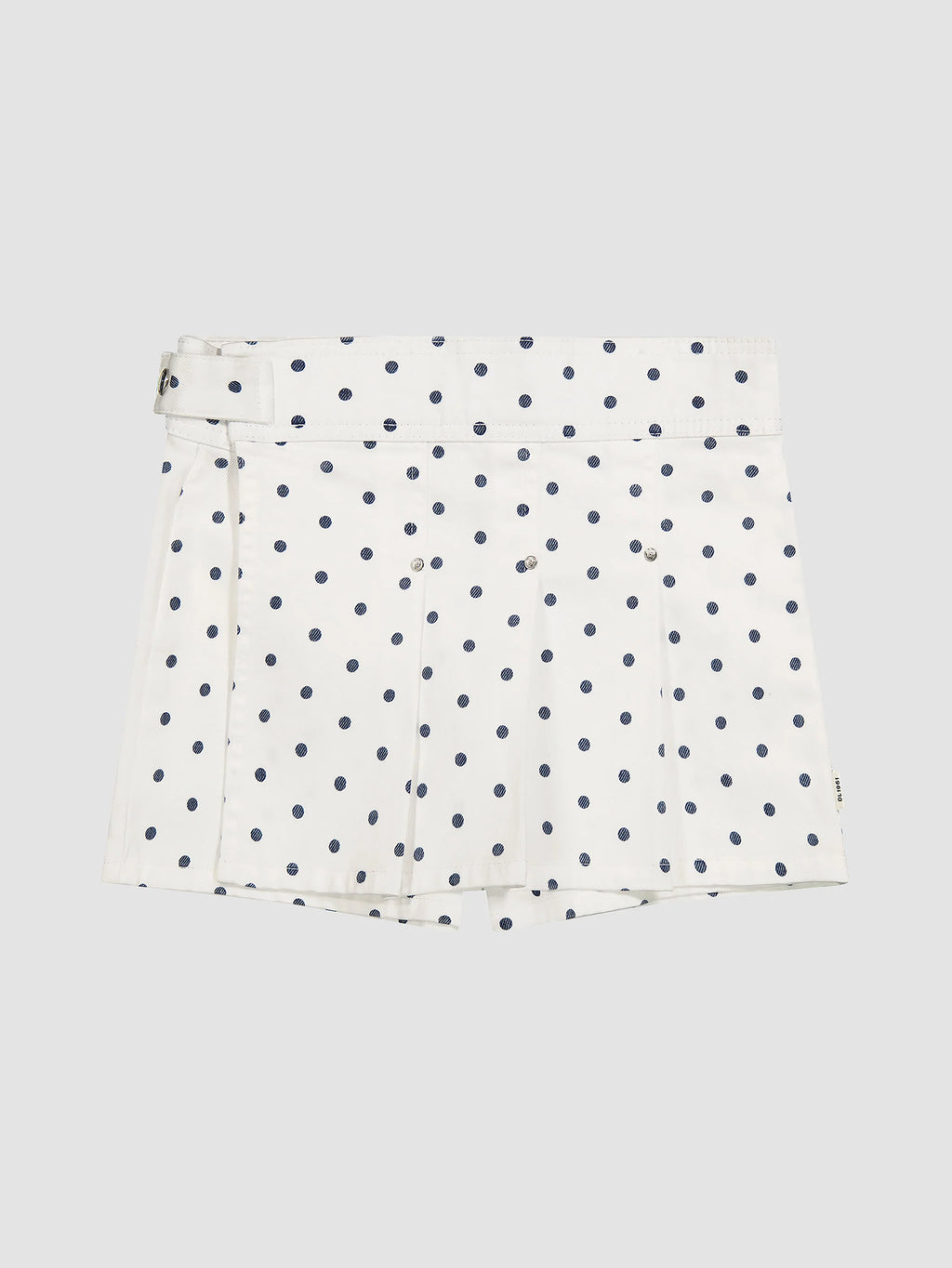 Lola is a playful, mini-skort with pleated hem detailing. This skirt and short combo is perfect for the girly-girl who likes to run around the playground. Marine Dots is white base with small bright navy polka dots. It features a silver zipper, tonal stitching, and a clean hem.