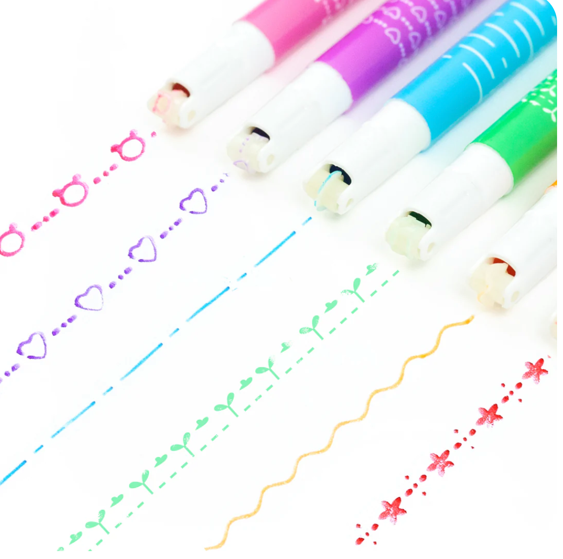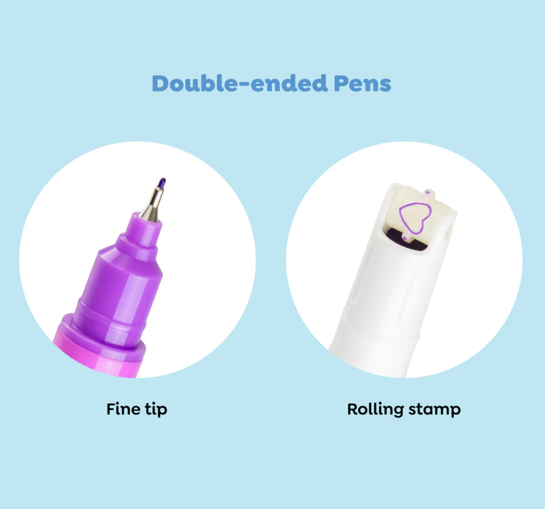 These super cool double-sided pens feature a fine tip on one side for detailed creations, and a unique, rolling stamp on the other side. Each of the six, vibrantly coloured pens has it's own unique pattern.
