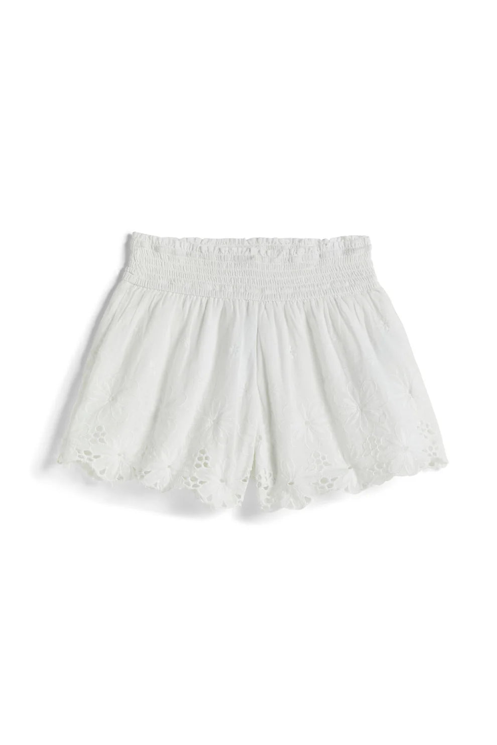 These cute shorts combine charm and comfort in a breezy spring essential. Designed with a smocked waistband for a secure fit, these shorts feature delicate floral eyelet detailing for a touch of femininity. Perfect for warm-weather outings, they offer an effortless blend of style and ease.