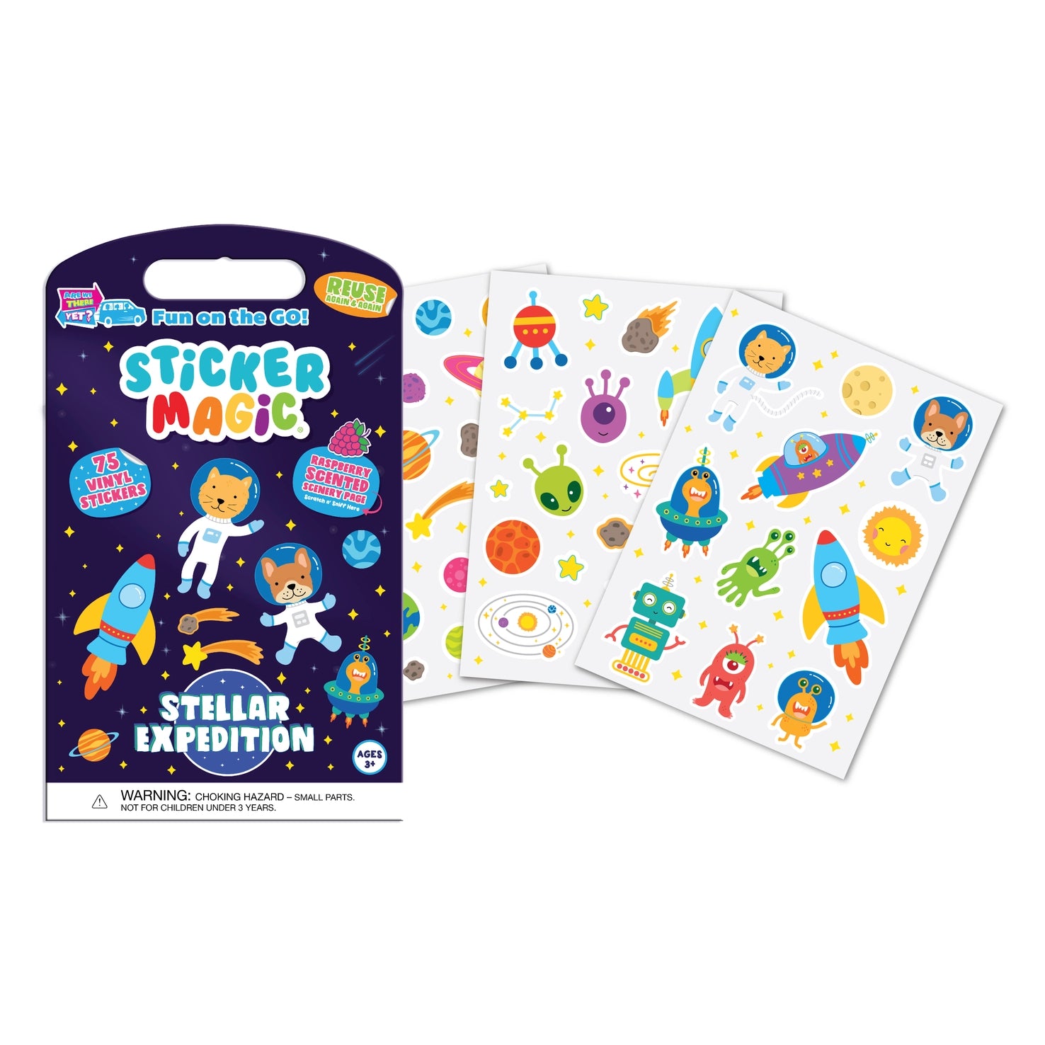 Sticker Magic - Stellar Expedition is an activity book that is perfect for travel days in the car or on the plane. Contains a scratch n' sniff cover and a scratch n' sniff scenery page. The product promotes enriching imagination, parent-child activity, visual training, and enhancing artistic skills. *Contains Scratch 'n Sniff Cover and Scenery Page (last up to 250 scratches) *Includes 4 Vinyl Sticker Sheets (75 Stickers) *Raspberry scented *Ages 3+