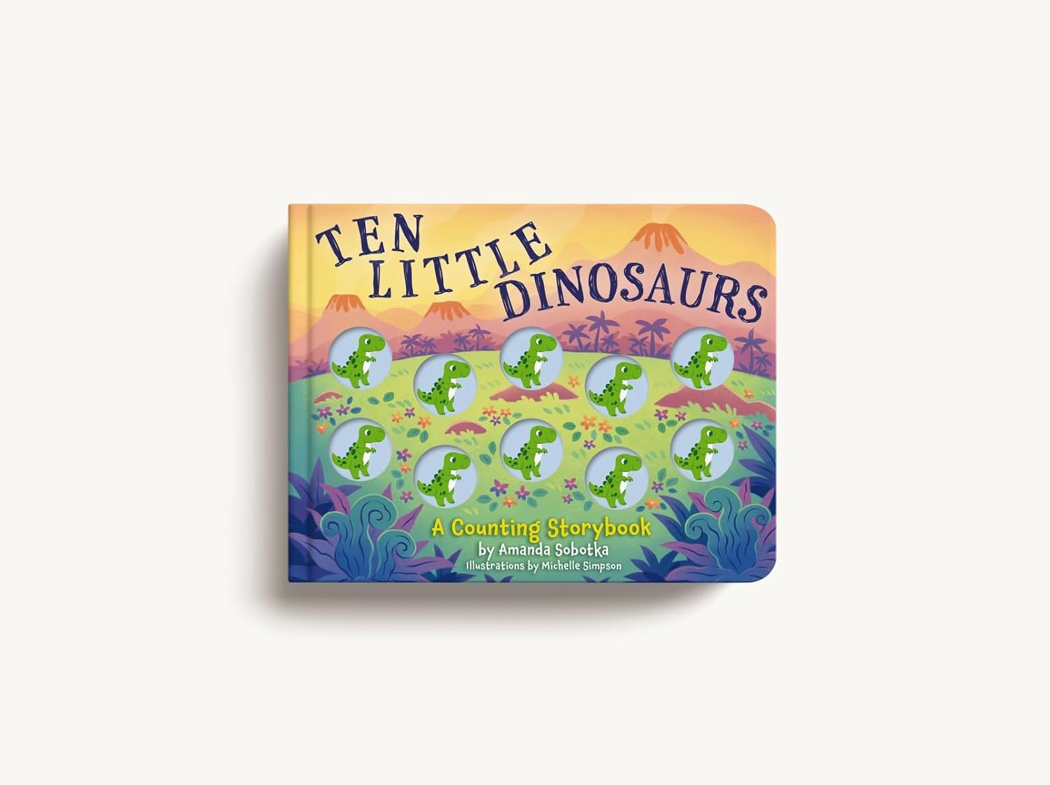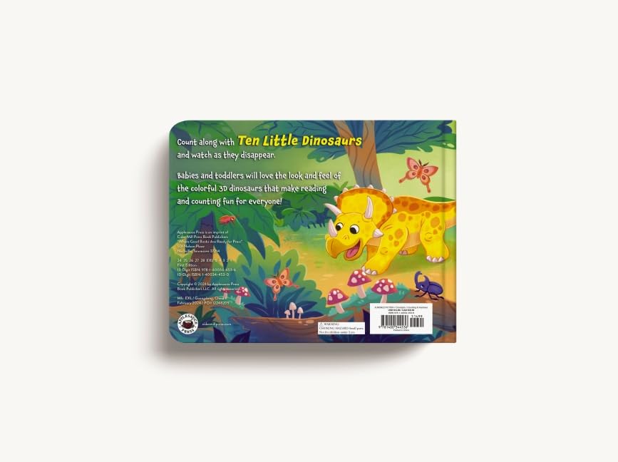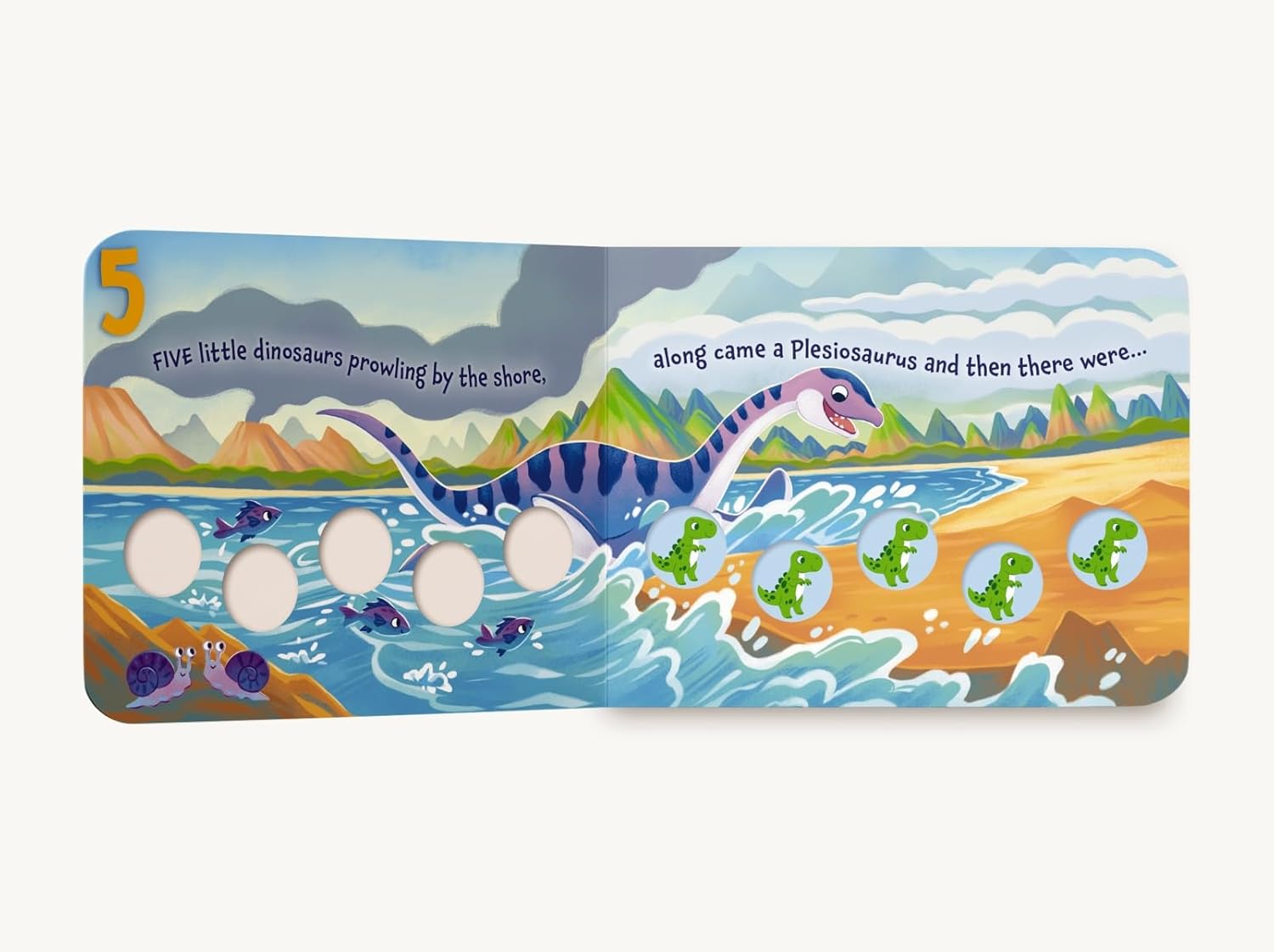 Learning to count has never been more fun. This unique board book counts from ten little dinosaurs all the way down to one with adorable illustrations. With each page, one more dinosaur disappears. To demonstrate this concept, this book uses tactile dinosaur buttons to help children count how many little dinosaurs are left as the story progresses. Follow along with the easy rhythm and rhymes of this story and let your child touch the colorful, built-in dinosaur toys for a creative, hands-on approach to counting. Start young ones on a lifetime of loving reading and learning with Ten Little Dinosaurs.