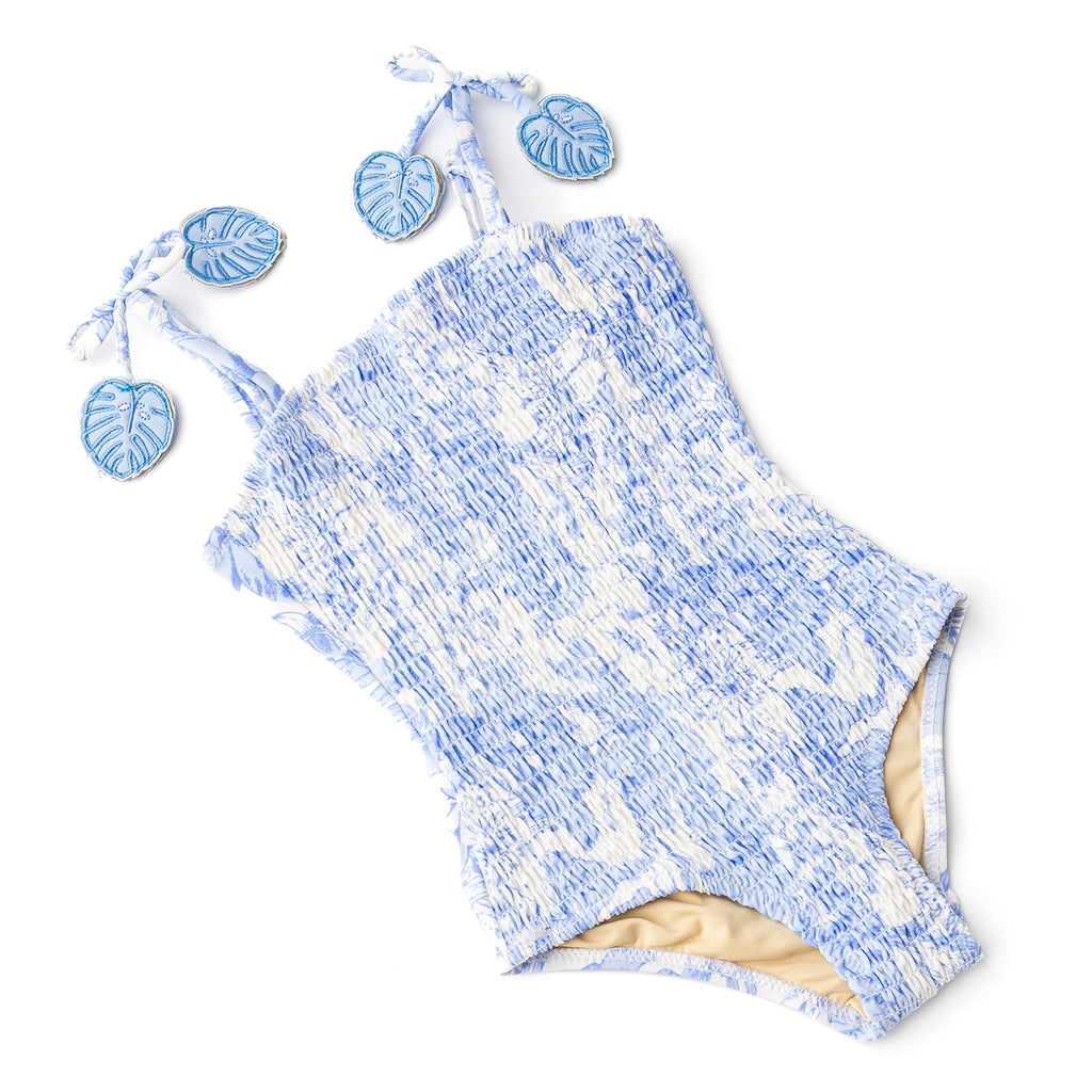 Let her shine in the Tropical Blues Girls Smocked One-Piece Swimsuita stylish and comfortable swimsuit that blends classic design with modern details. Featuring beautiful smocked detailing and adjustable straps, this swimsuit offers a perfect fit and a fun, flattering look for all her summer adventures. the Tropical Blues Girls Smocked One-Piece Swimsuit features a vibrant tropical print thats perfect for beach days, poolside fun, or any warm-weather adventure. Stylish, comfortable, and sun-safe, its the ideal swimsuit for your little ones summer wardrobe.