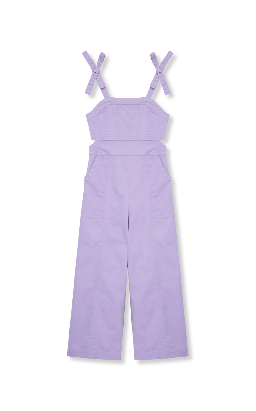 Sleeveless wide leg jumpsuit with shoulder bow detailing and waist cut outs. Add a pop of color to your closet today!