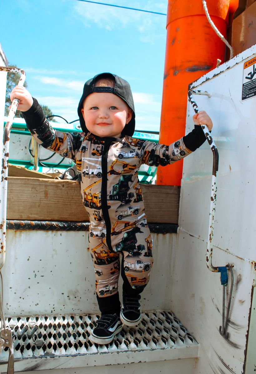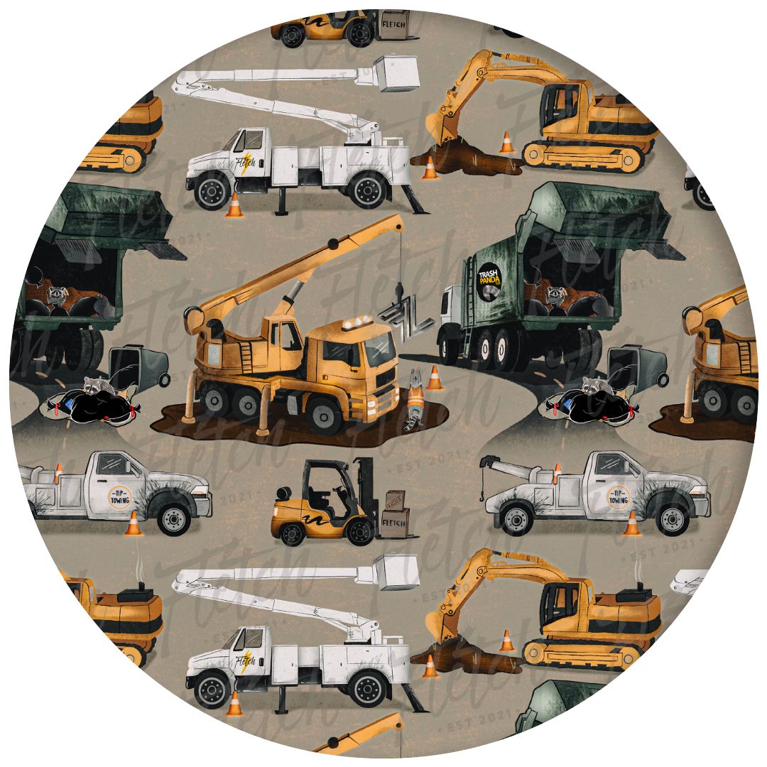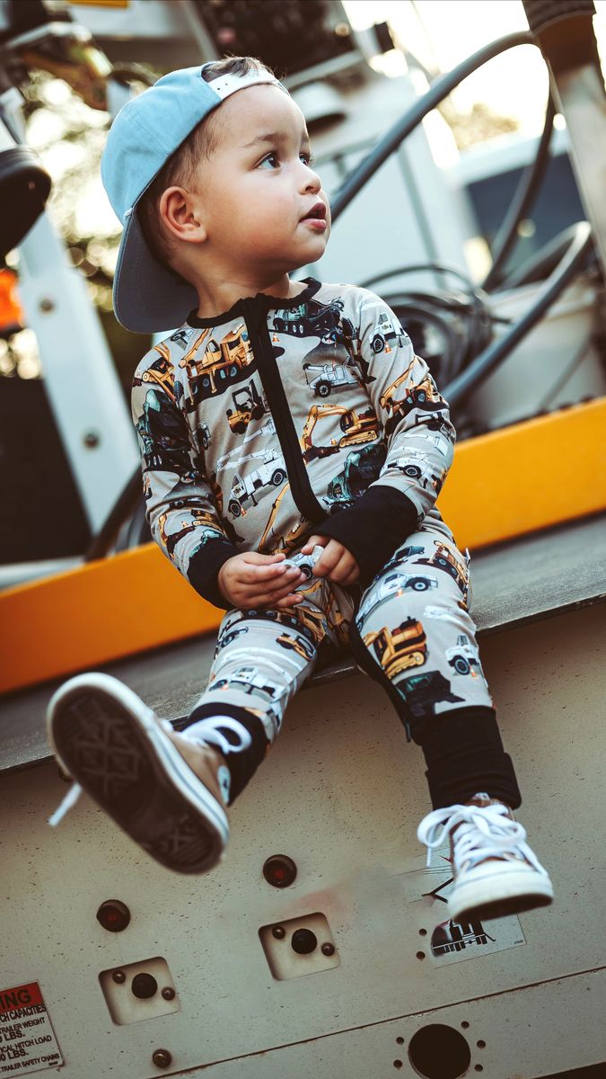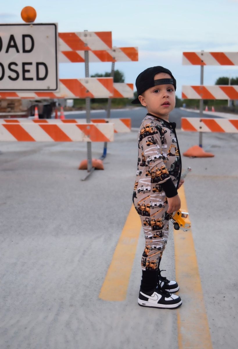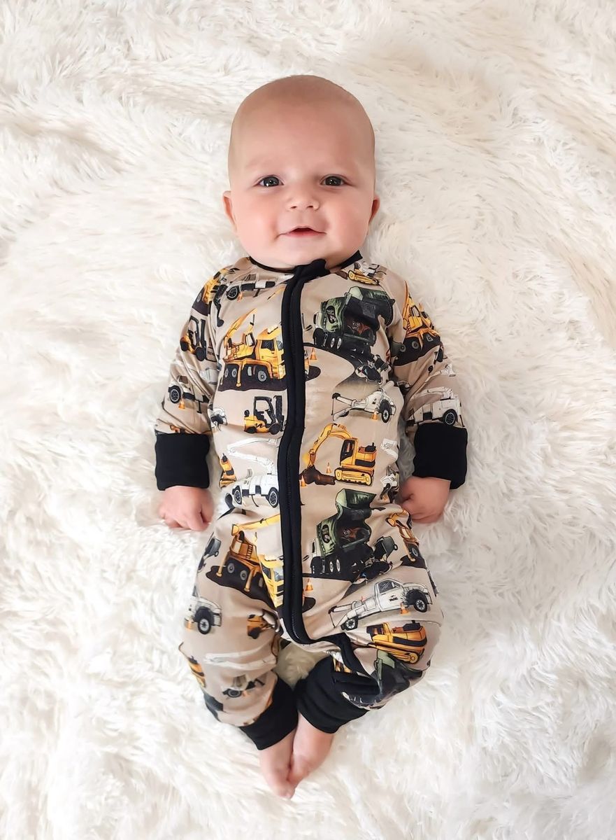 This print features a pattern of various construction vehicles in a neutral beige/ tan background. Our design includes: mobile cranes with extendable booms, utility trucks with bucket lifts/ cherry pickers, bulldozers/ excavators with forklifts, and multiple kinds of pickup trucks. Truck obsessed boys and girls will love this print in a bamboo pj set or convertible footie pajamas. Get constructive in this print from our Core Collection - a perfectly engaging design for little ones just beginning to recognize and identify different types of construction trucks and vehicles.